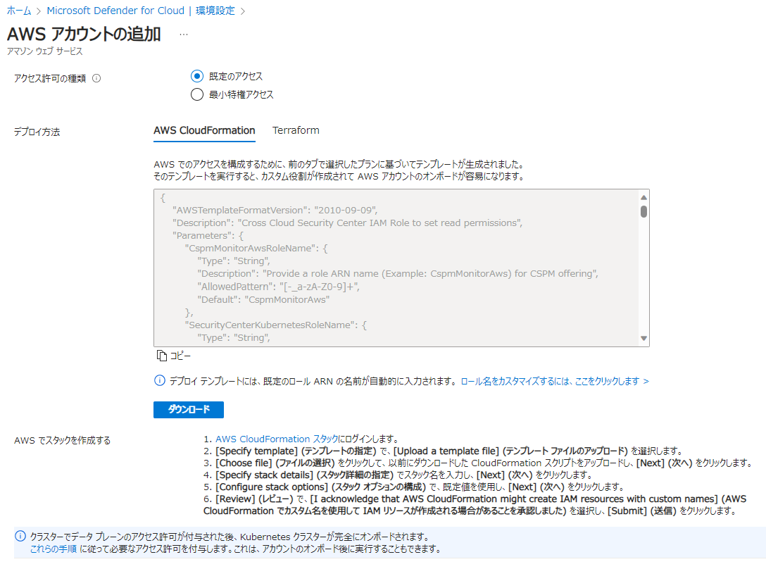 アクセス許可の種類は「既定のアクセス」、デプロイ方法を「AWS CloudFormation」を選択します。