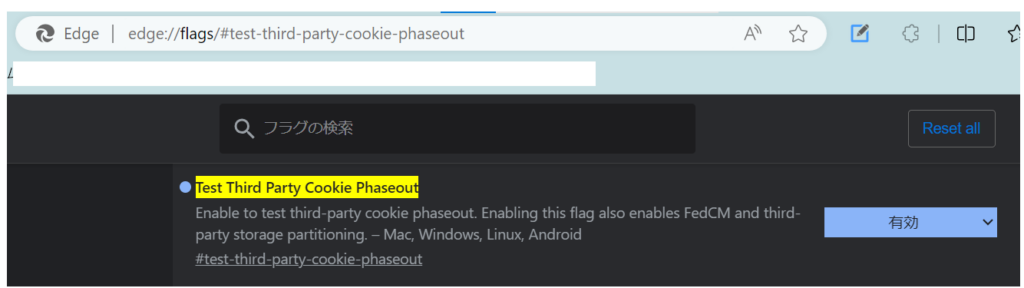 1. Edge上のアドレスバーに「edge://flags/#test-third-party-cookie-phaseout」と入力します。
