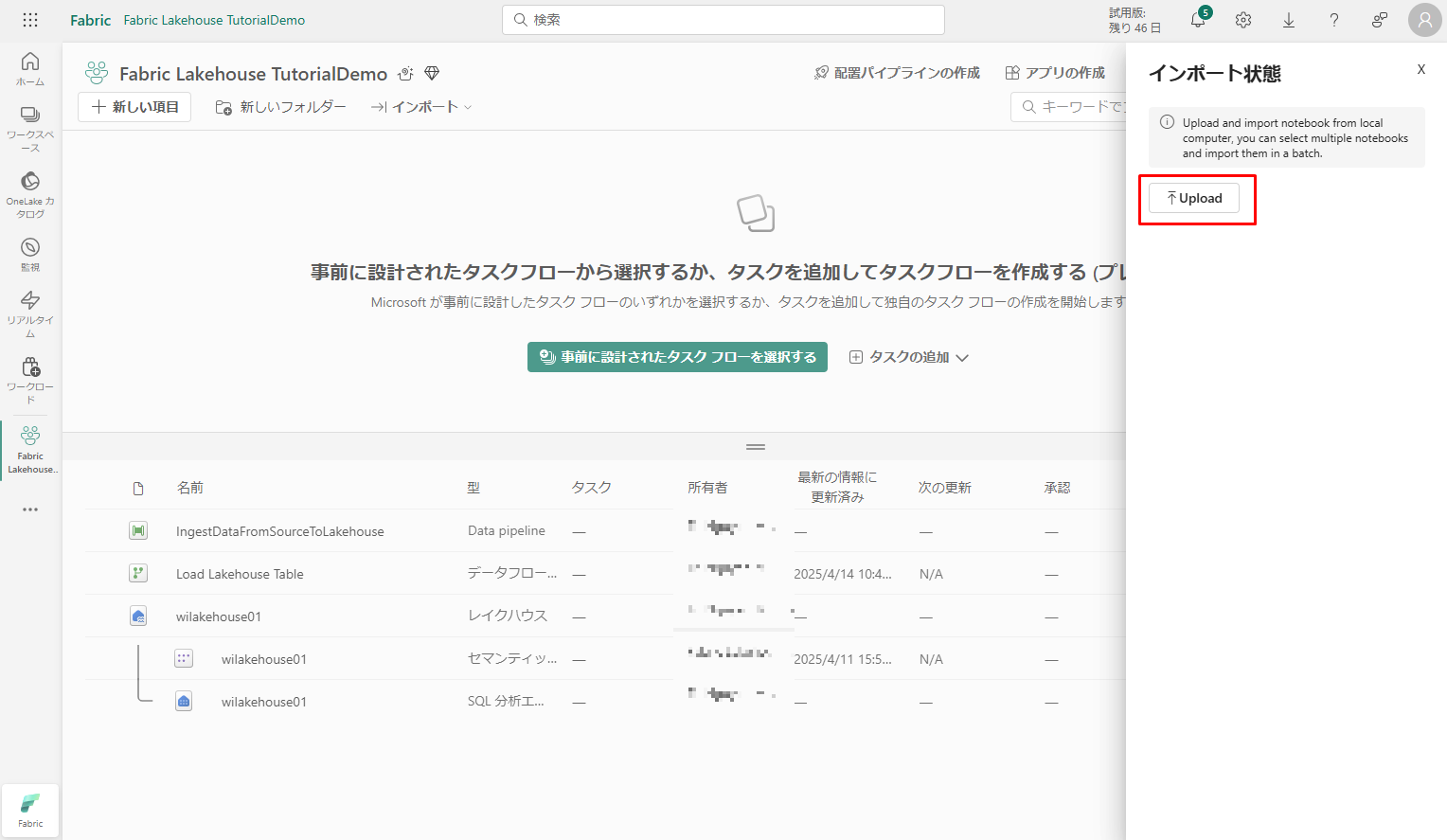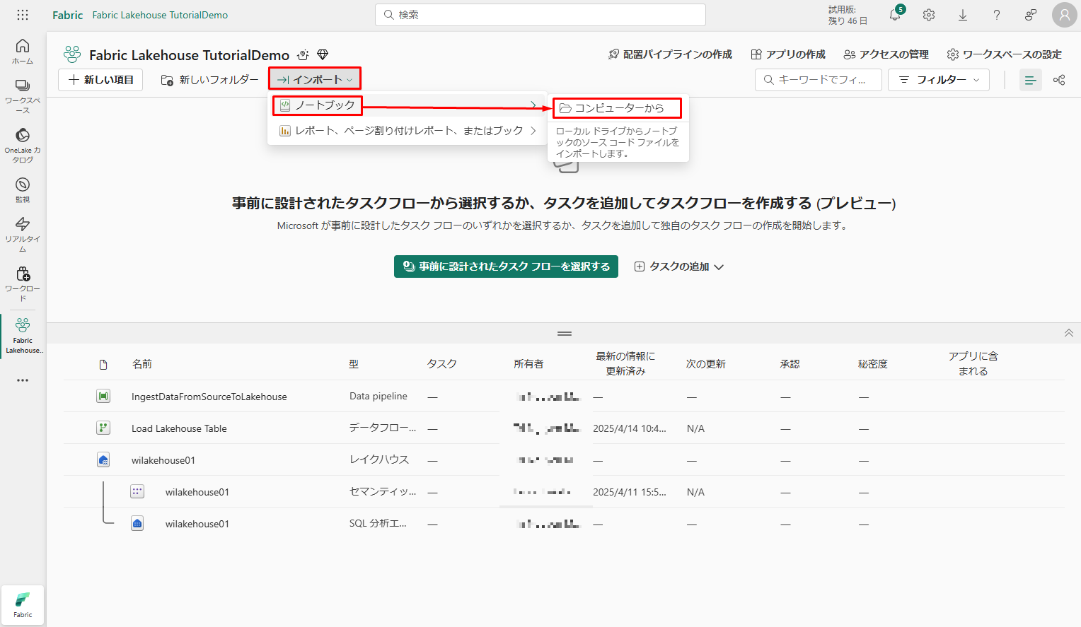 インポートの成功後、ワークスペースのアイテム ビューに移動し、新しくインポートされたノートブックを確認できます。