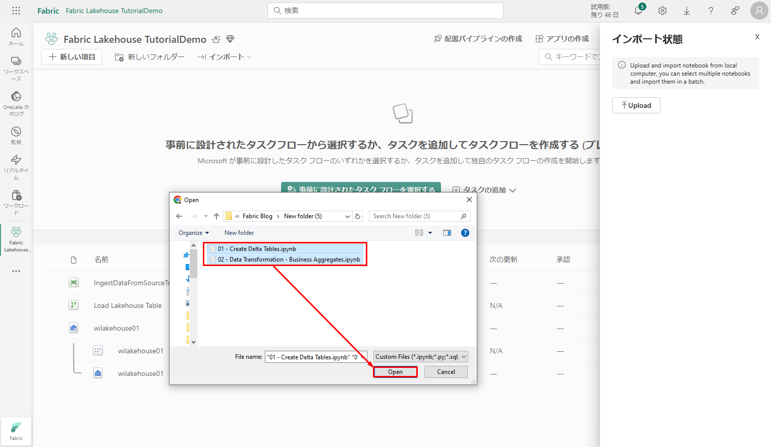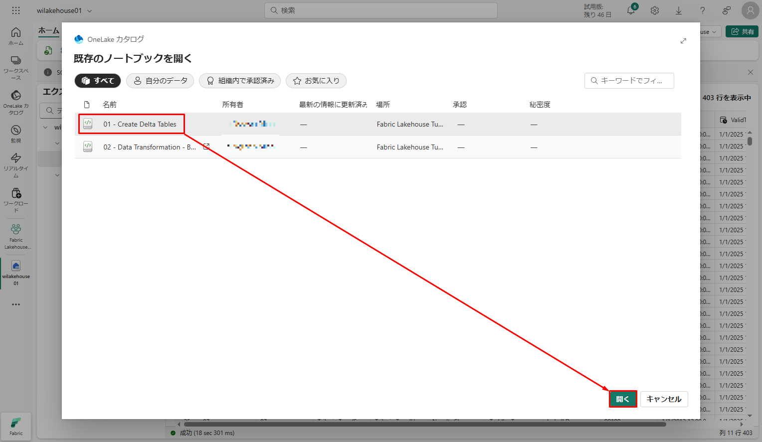 既存のノートブックの一覧から、「01 – Create Delta Tables」>「開く」を選択します。