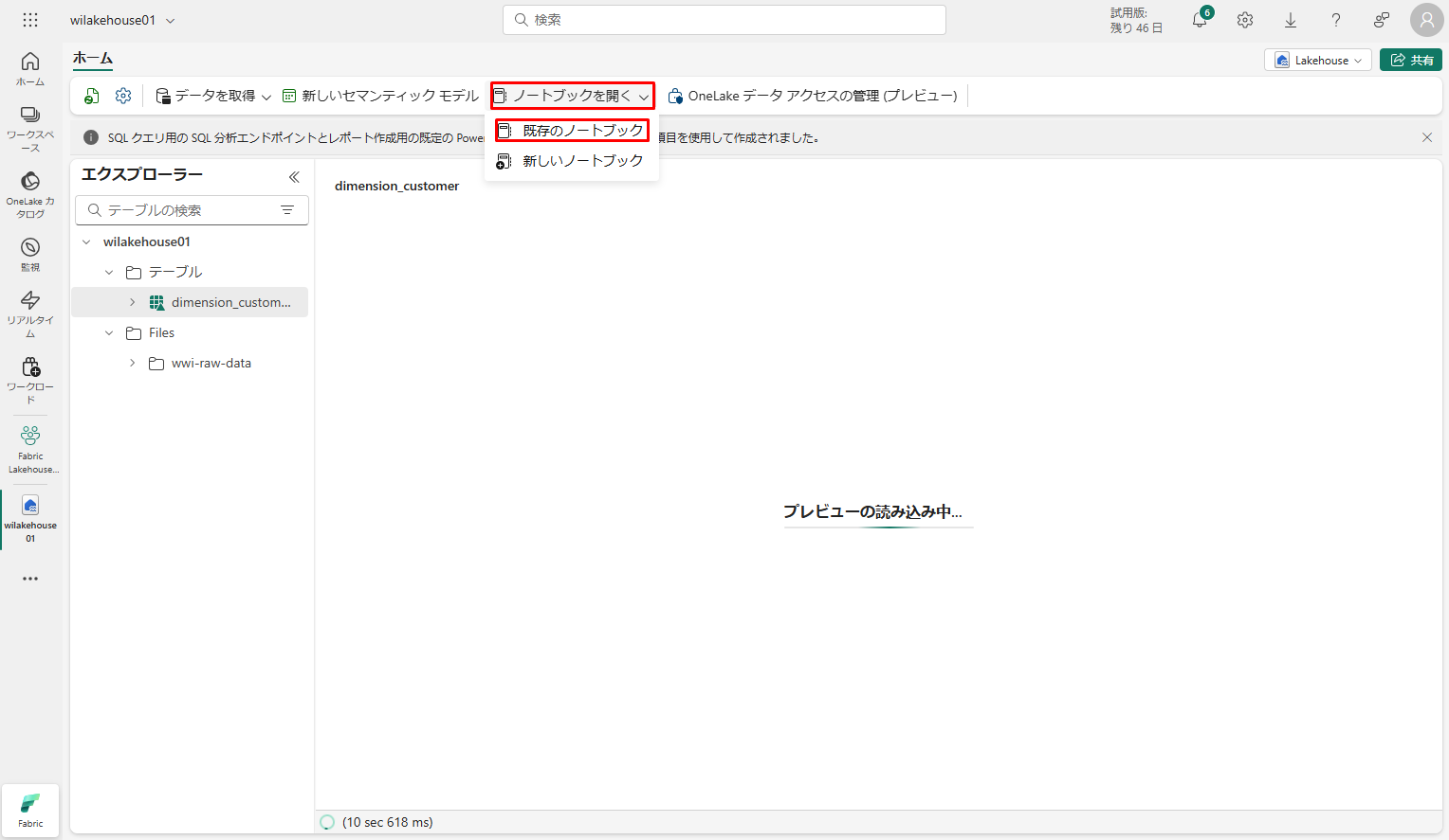 レイクハウス [エクスプローラー] で開いているノートブックにノートブックが開いているレイクハウスに既にリンクされています。