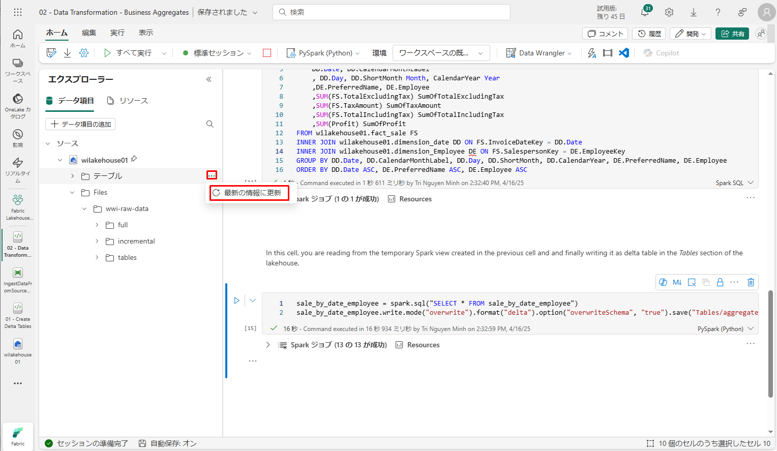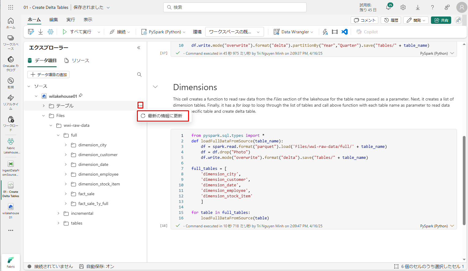 作成されたテーブルを検証するために、wilakehouse01 レイクハウスを右クリックして「最新の情報に更新」を選択します。