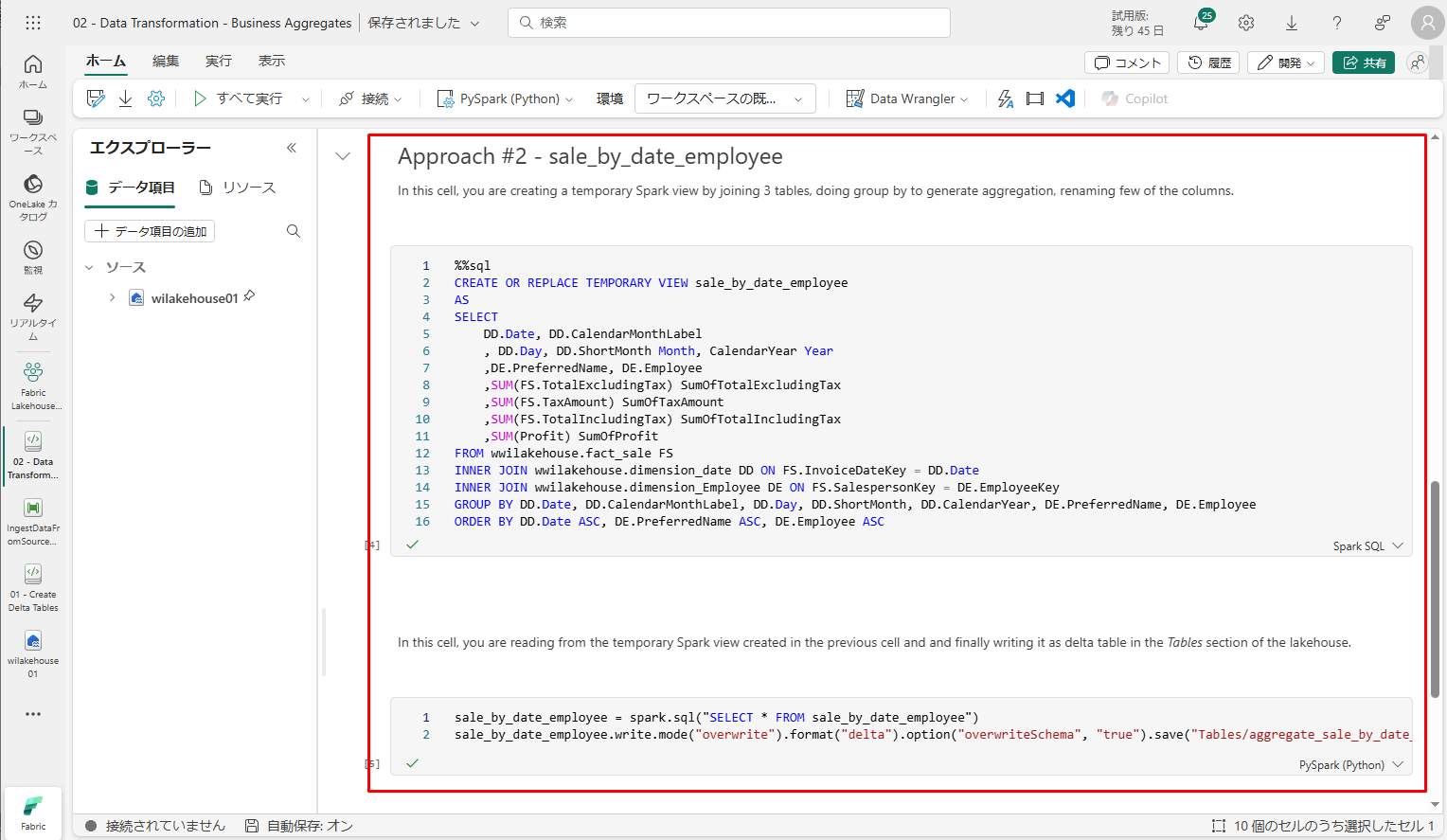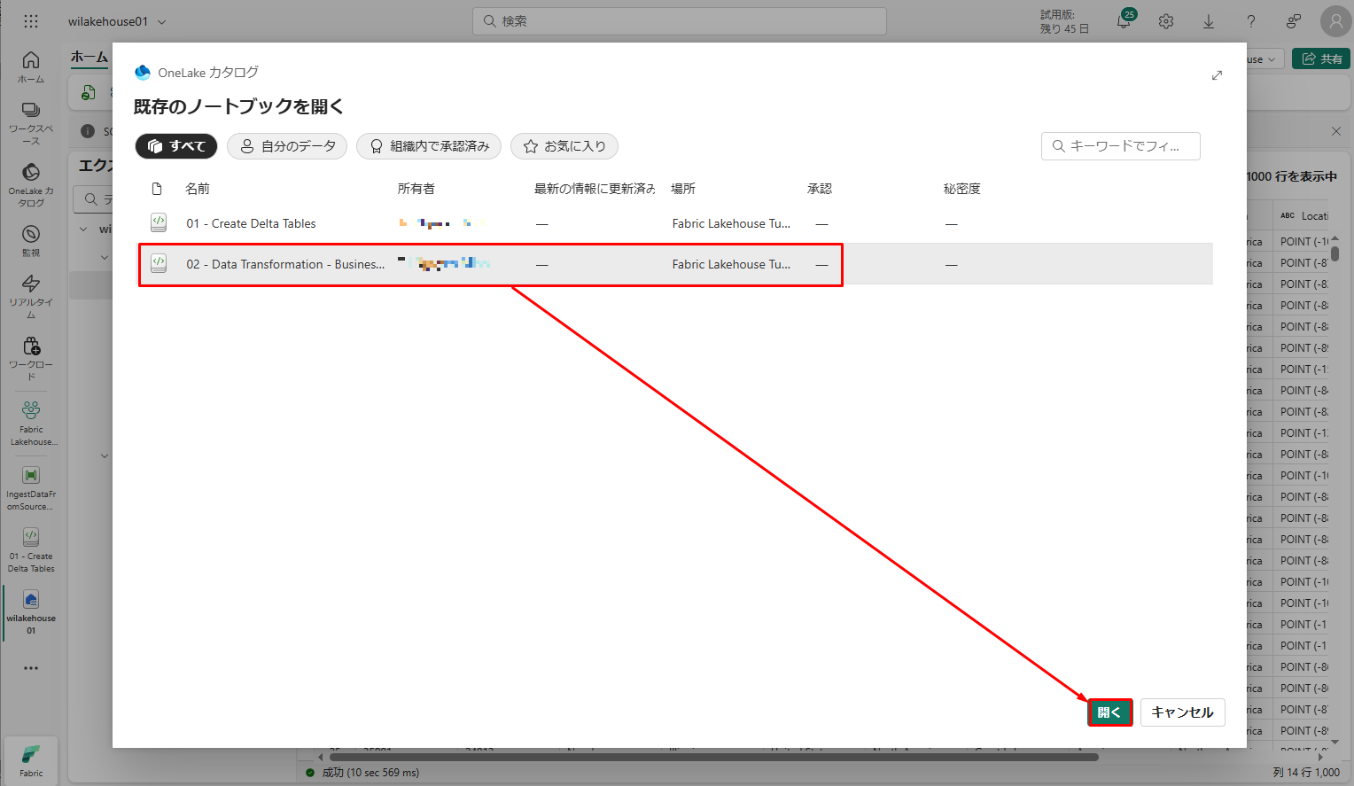 既存のノートブックの一覧から、「02 – Data Transformation -Business」>「開く」を選択します。