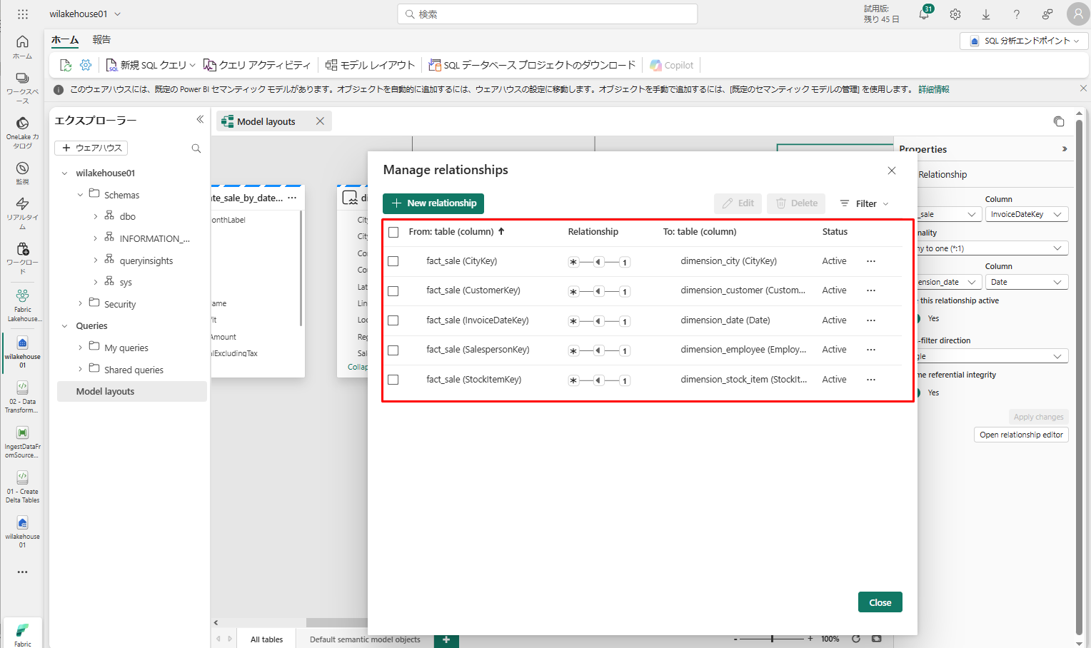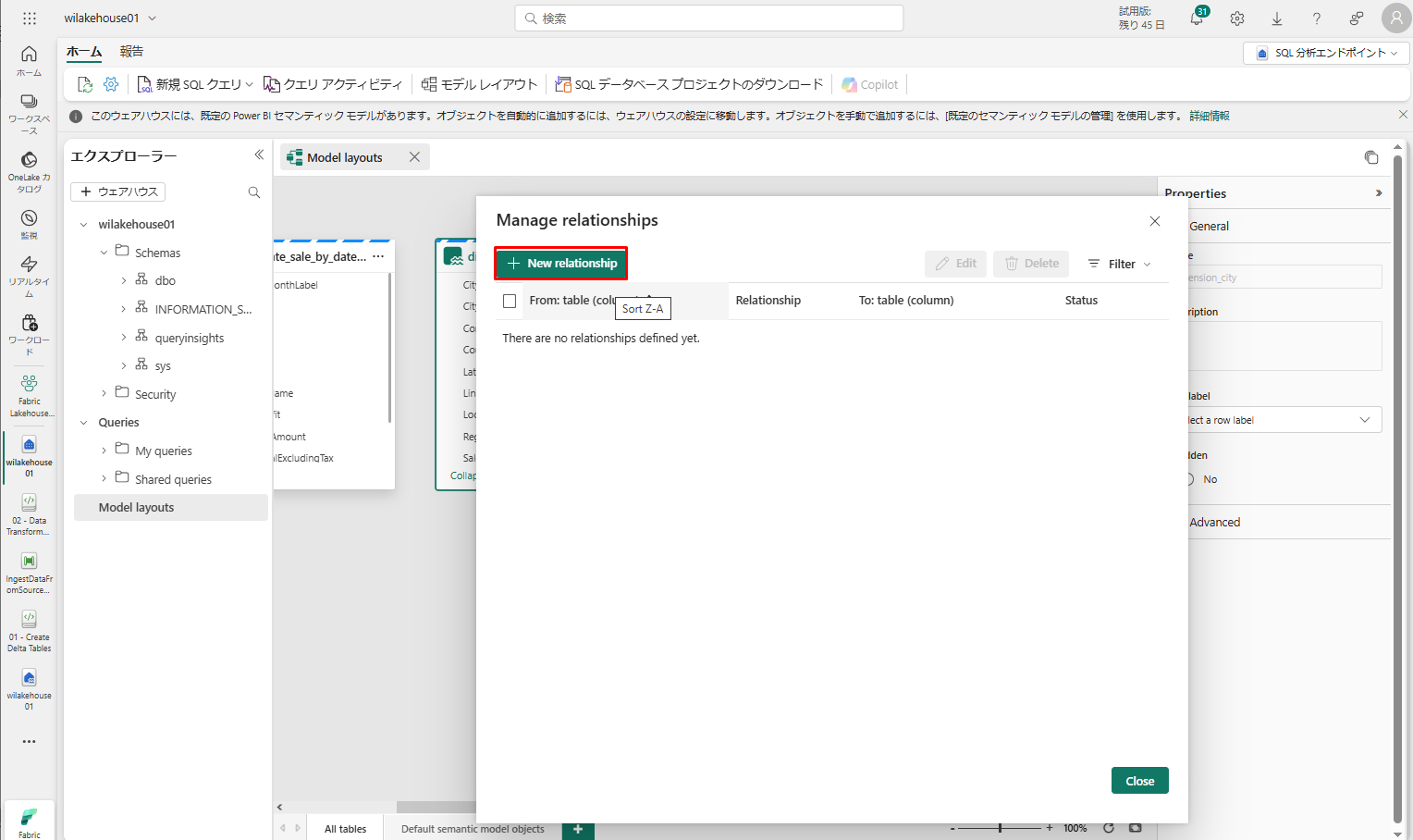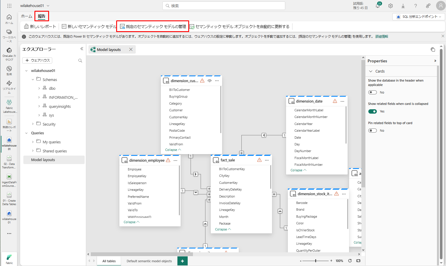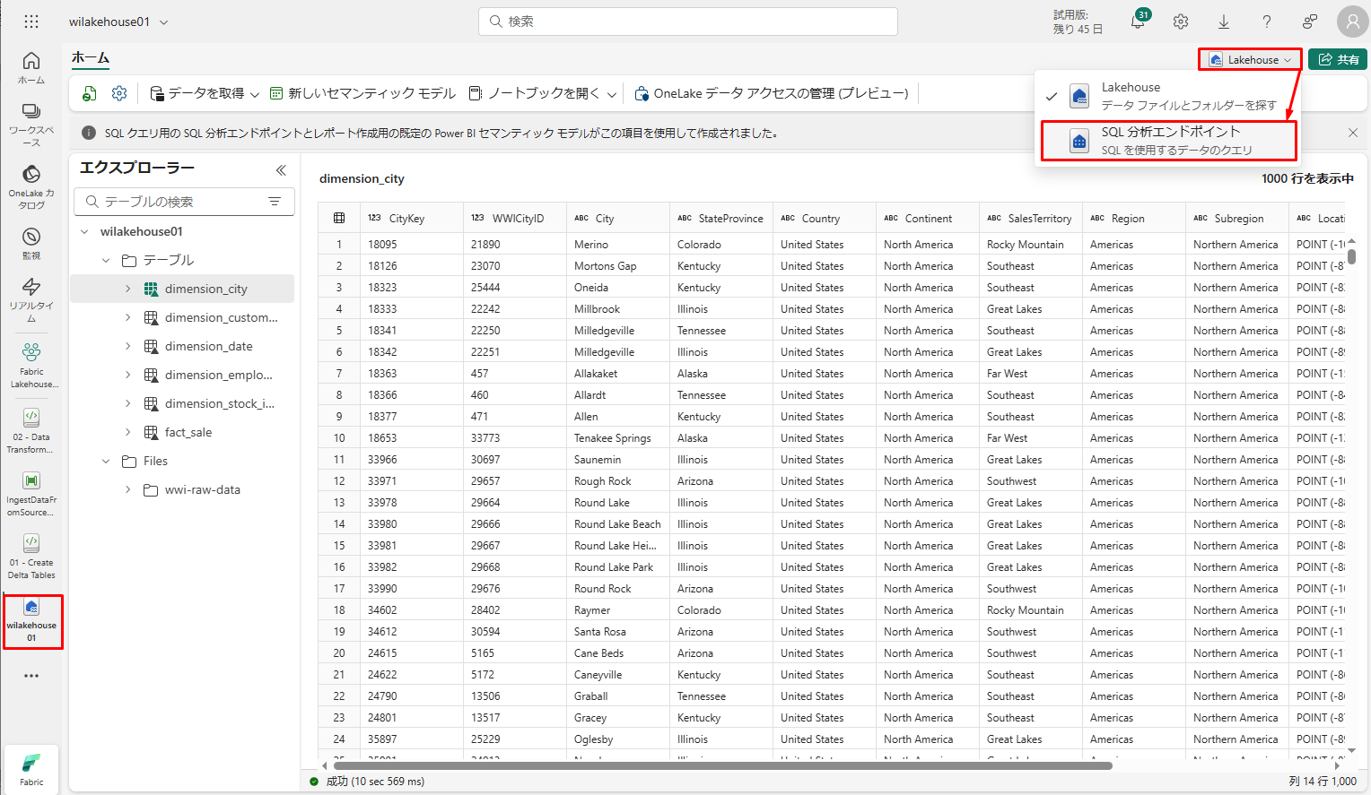 wilakehouse01 レイクハウスで、画面の右上にある「Lakehouse」ドロップダウン メニューから「SQL 分析エンドポイント」を選択します。