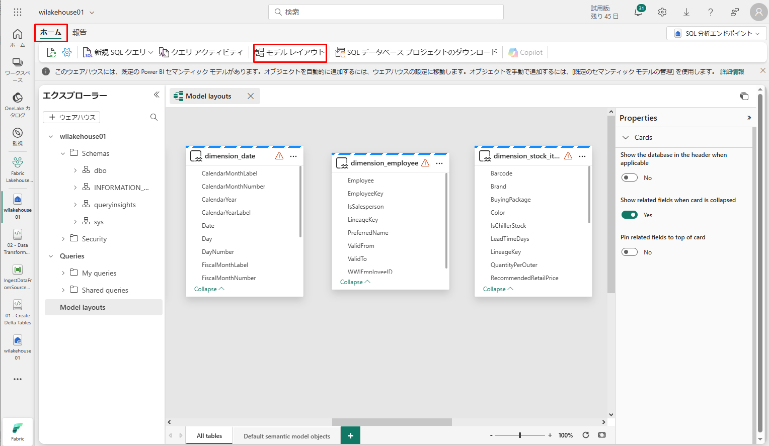 ホームタブで「モデルレイアウト」タブをクリックすると、既定の Power BI セマンティック モデルが表示されます。