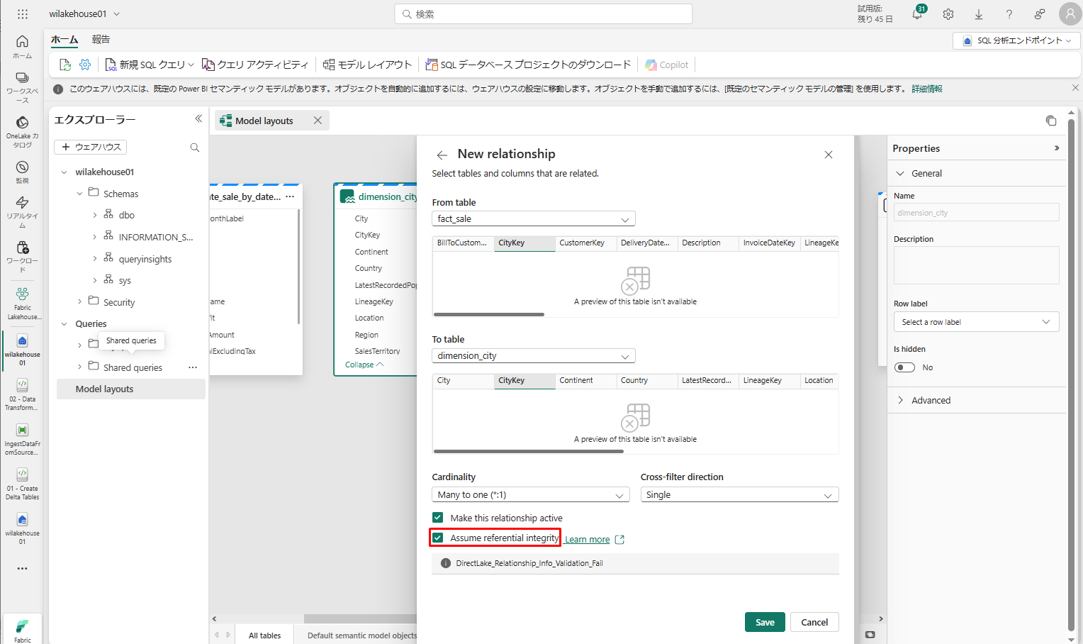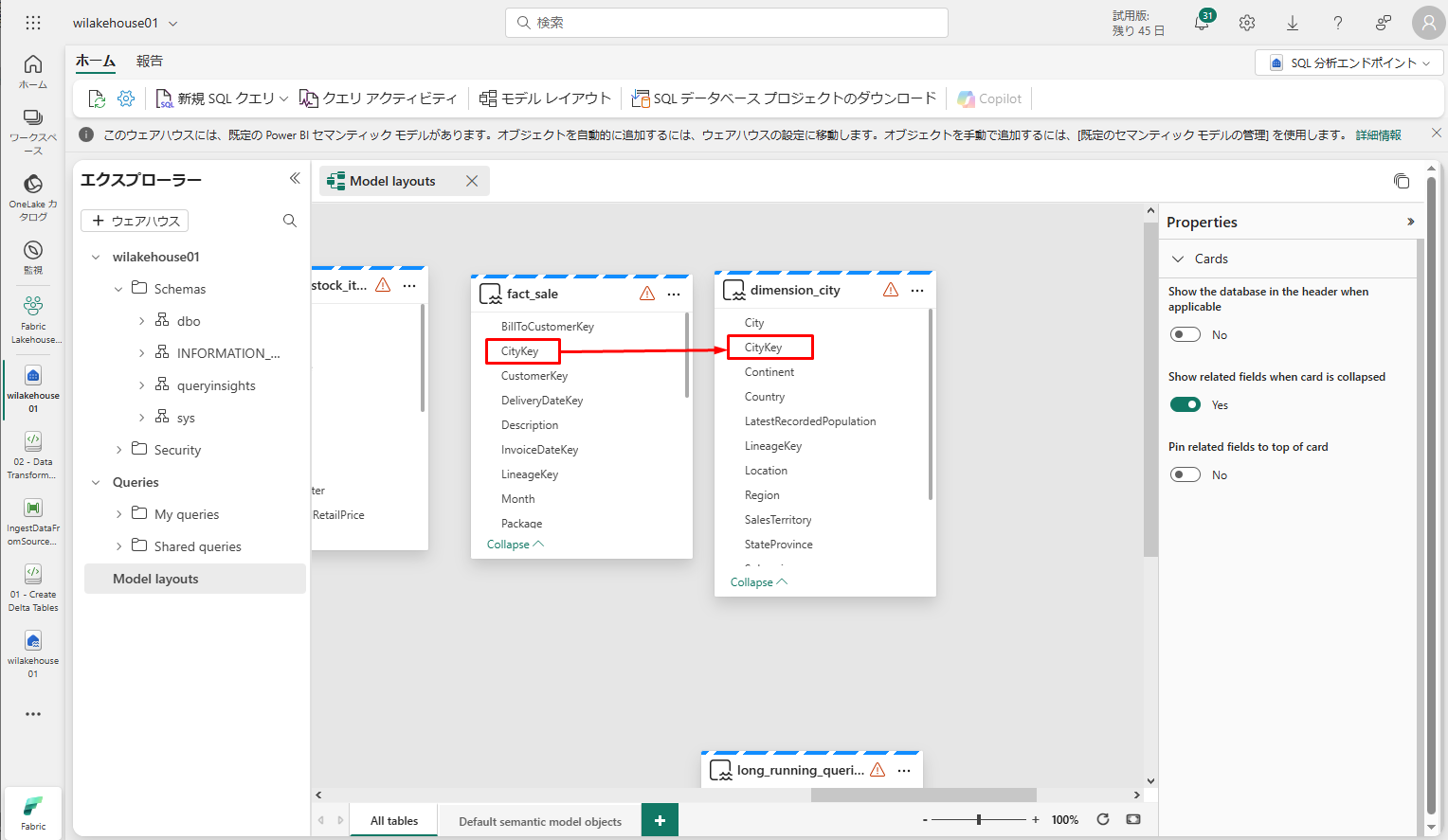 • テーブル 1 には、fact_sale と CityKey の列が設定されています。
