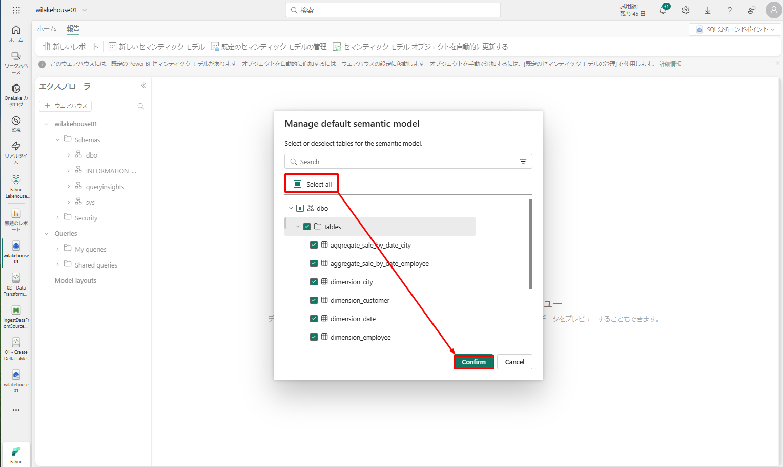 「既定のセマンティックモデルの管理」ダイアログ ボックスで 「すべて選択」>「確認」をクリックします。