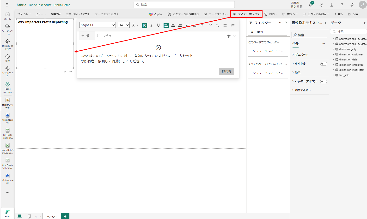• リボンで、「テキスト ボックス」を選択し、「WW Importers Profit Reporting」と入力します。