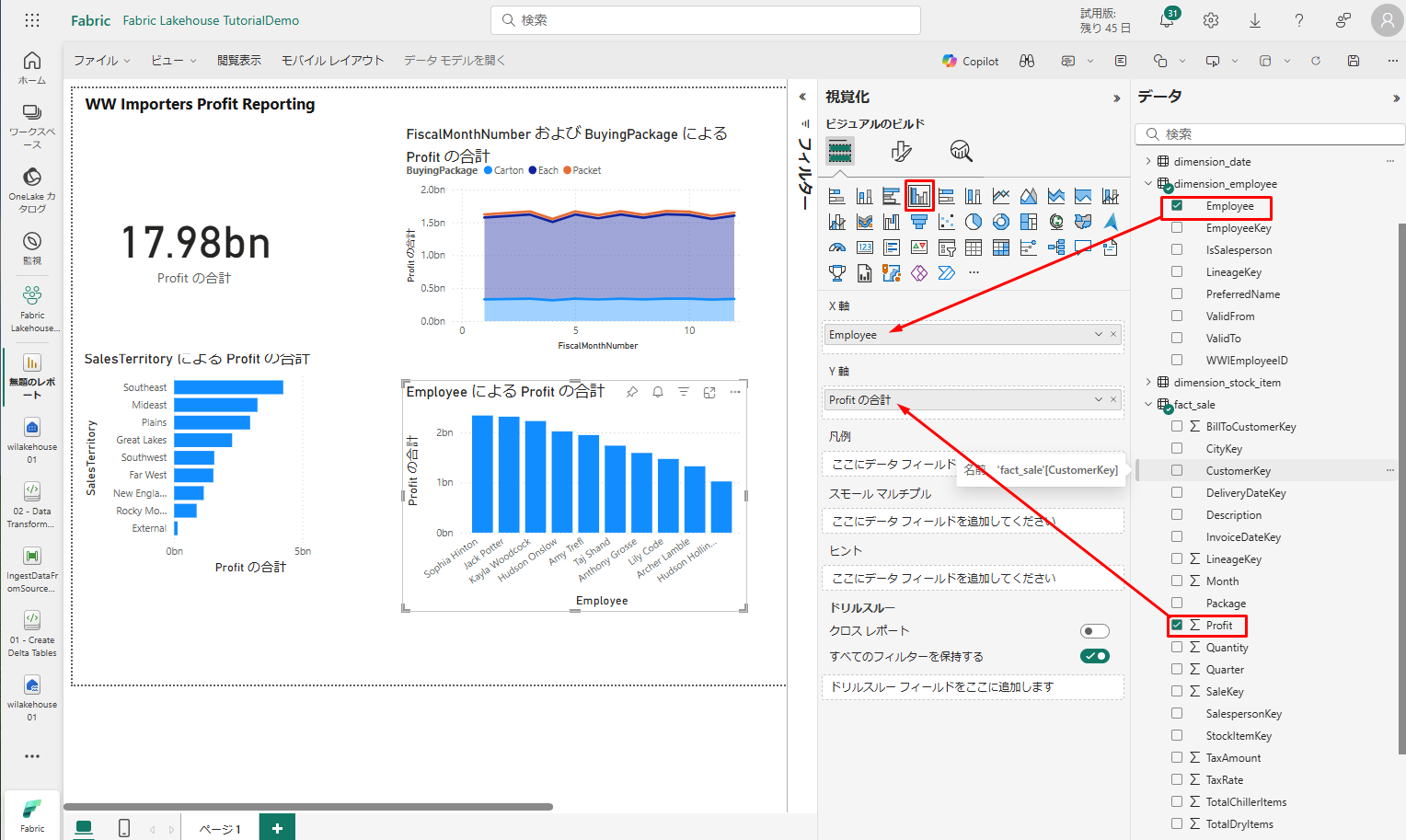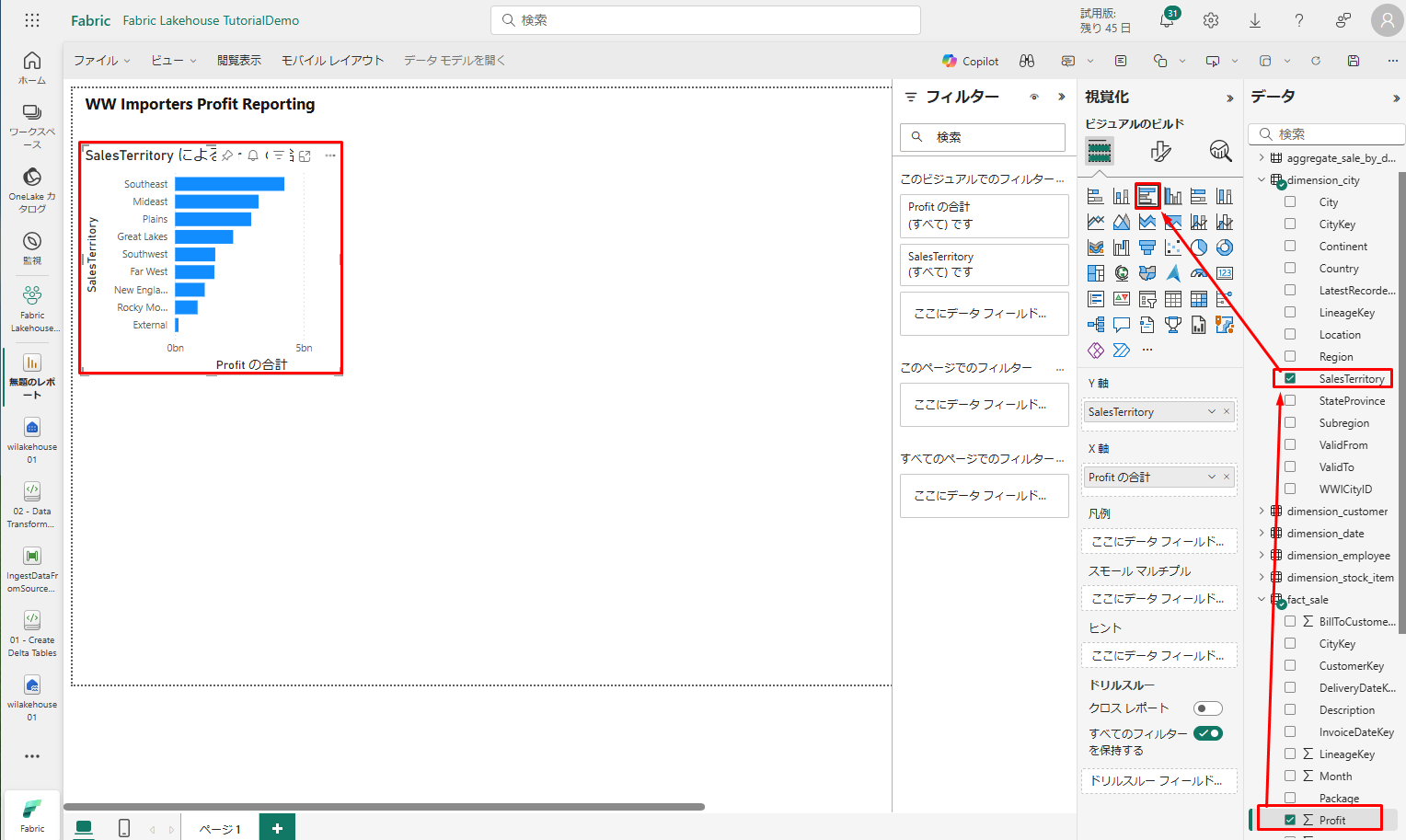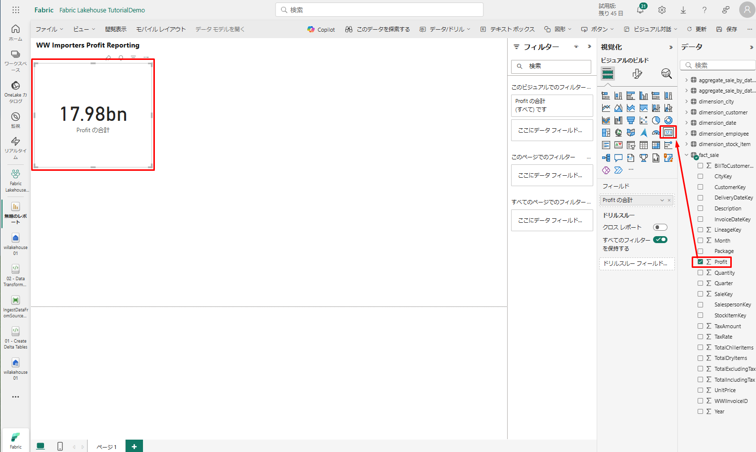• 「データ」ウィンドウで、「fact_sales」>「Profit」ボックスをチェックします。