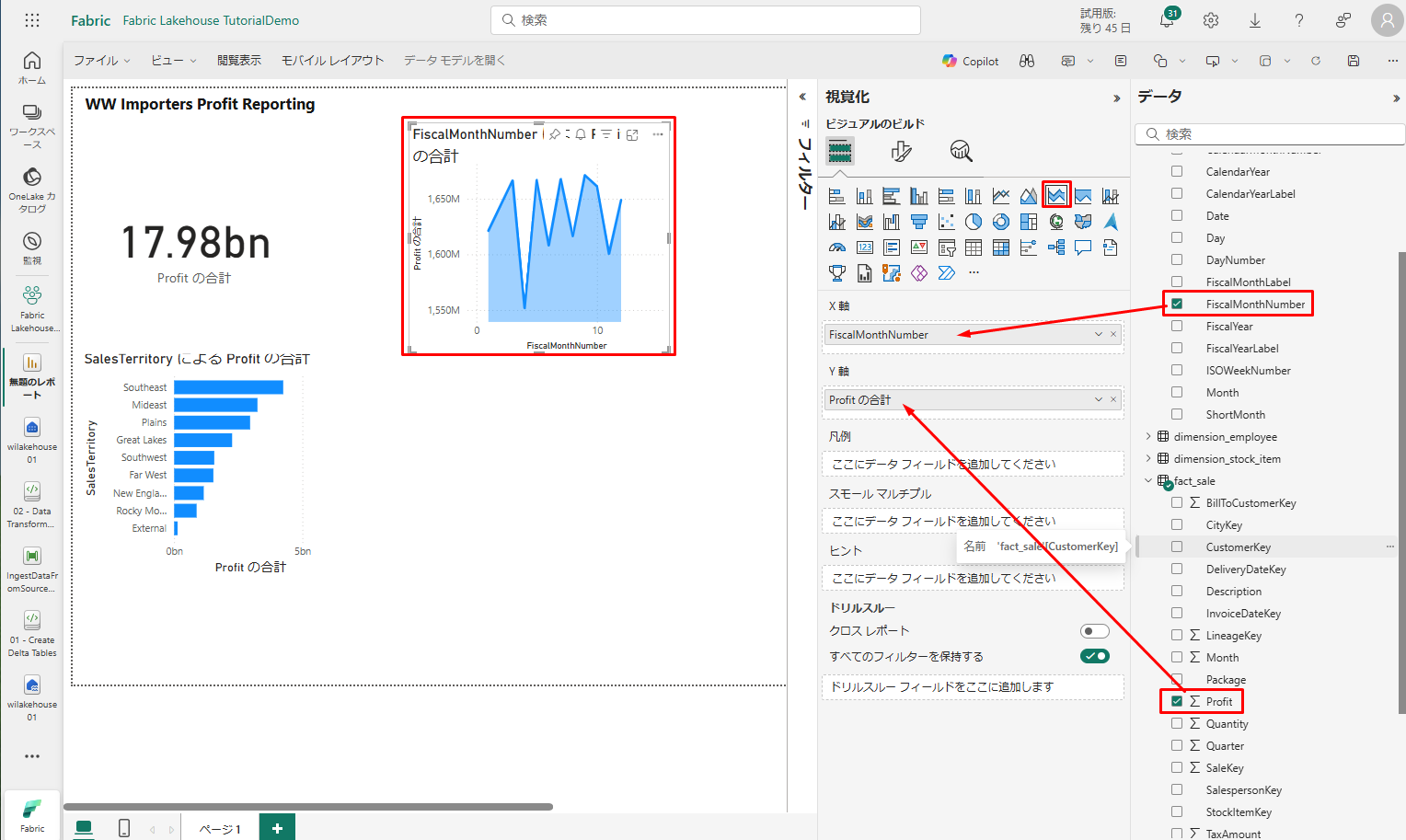 • 「データ」ウィンドウで、「fact_sales」>「Profit」ボックスをチェックします。「dimension_date」>「FiscalMonthNumber」ボックスをチェックします。