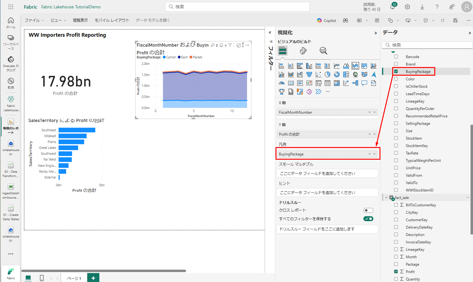 「データ」ウィンドウで、「dimension_stock_item」を展開し、「BuyingPackage」を「凡例」フィールドにドラッグします。