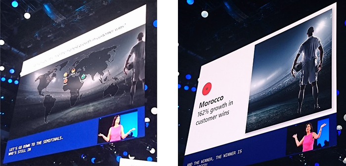 初日、二日目はCorporate Vice PresidentのGavriella Schuster氏が登壇し、FY18を乗り切るために一役も二役も買った全世界のパートナーに向け感謝の意を述べつつ、ちょうどイベント中に行われていたWorldcupにちなんで?Microsoft Partner選手権が行われました。