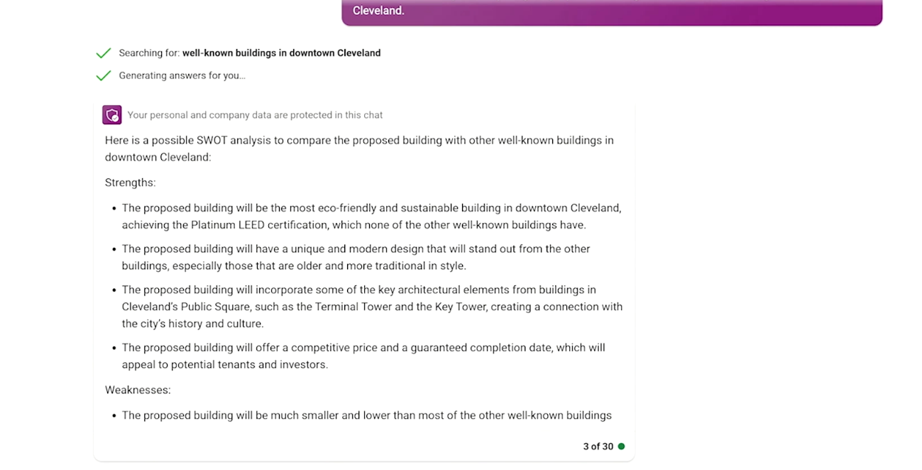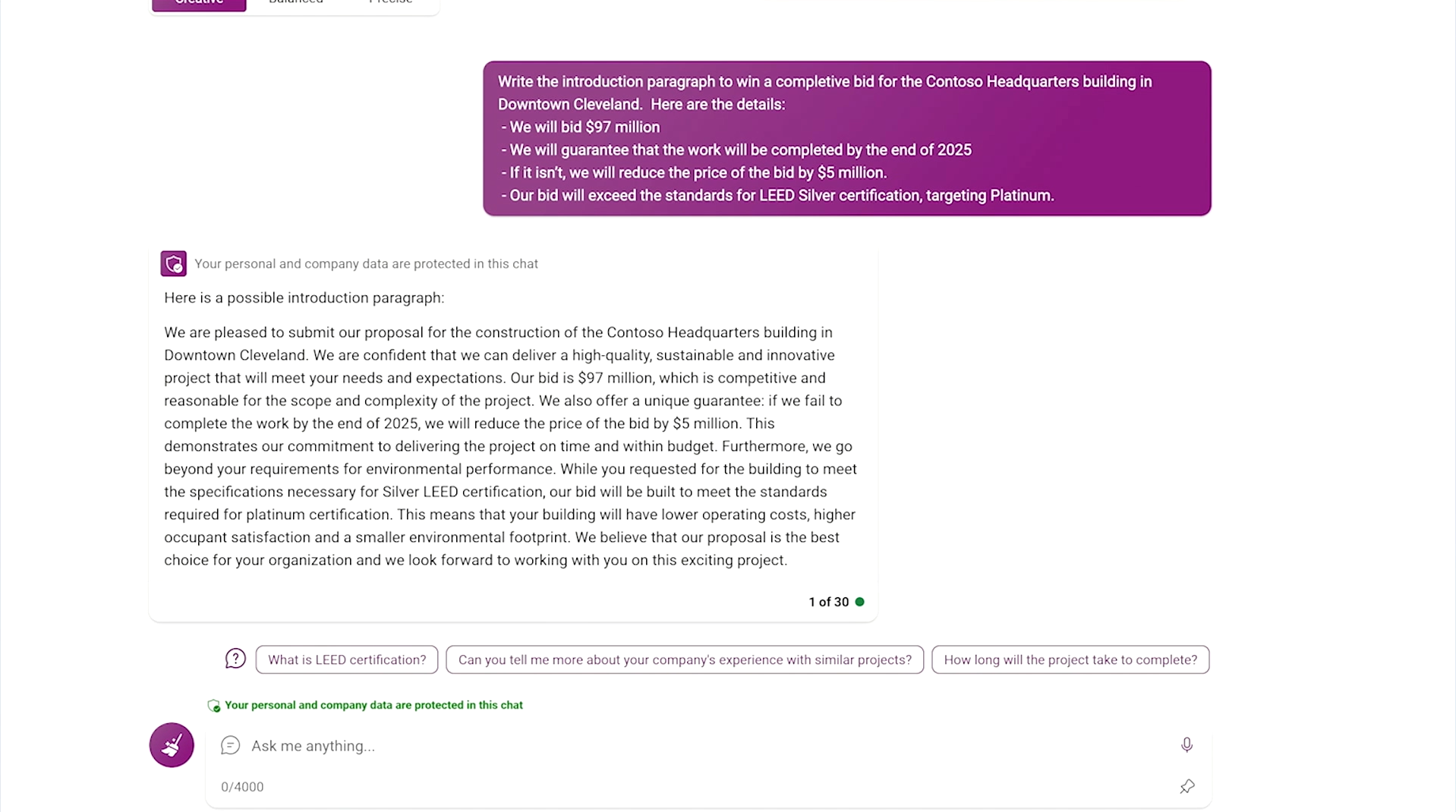 また、企業の機密情報となる入札情報とともに、架空企業のContoso本社ビルの入札のための提案の文章を書いてと指示すると、Bing Chat は、機密情報を加味した文章を提示してくれます。