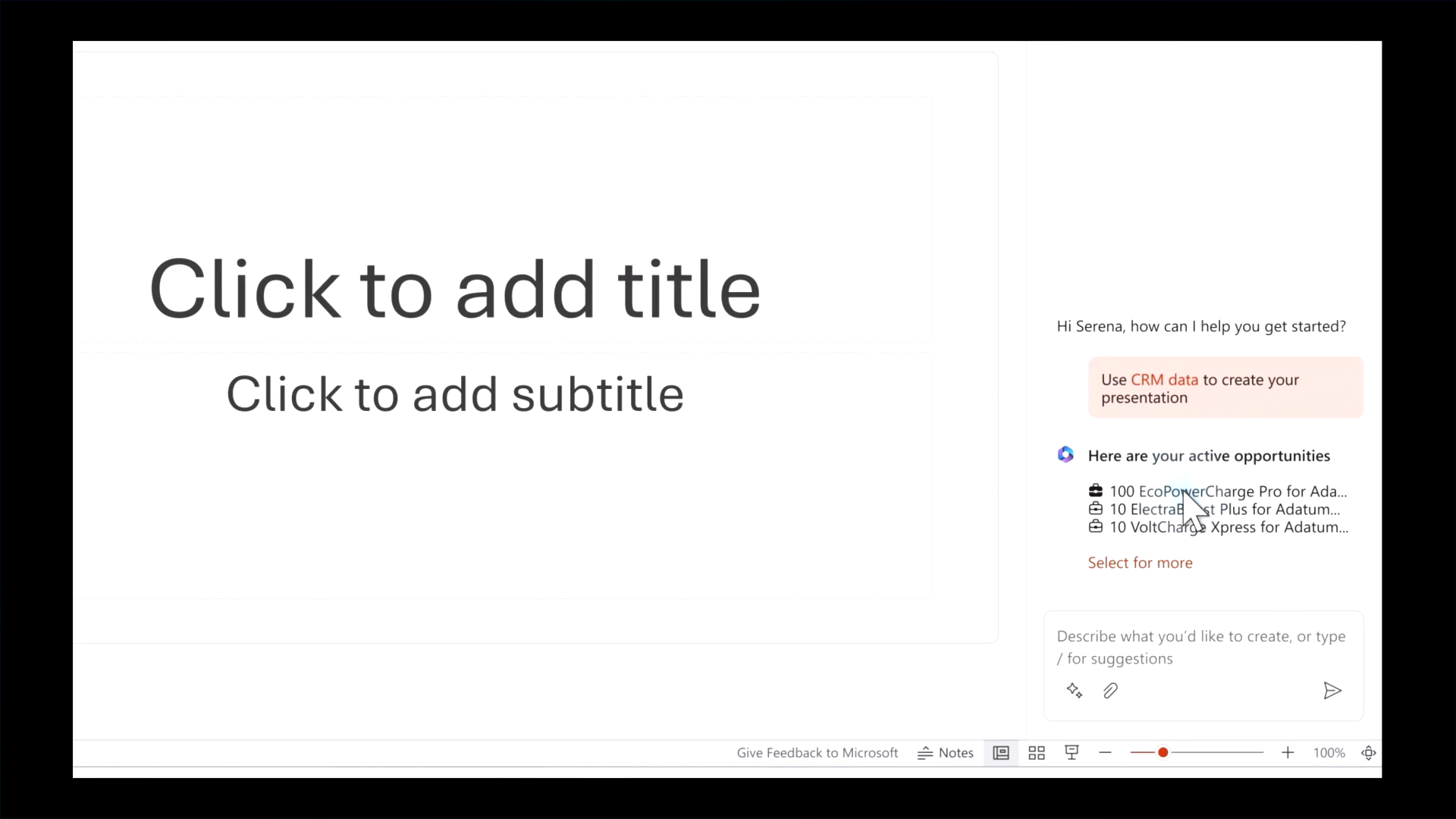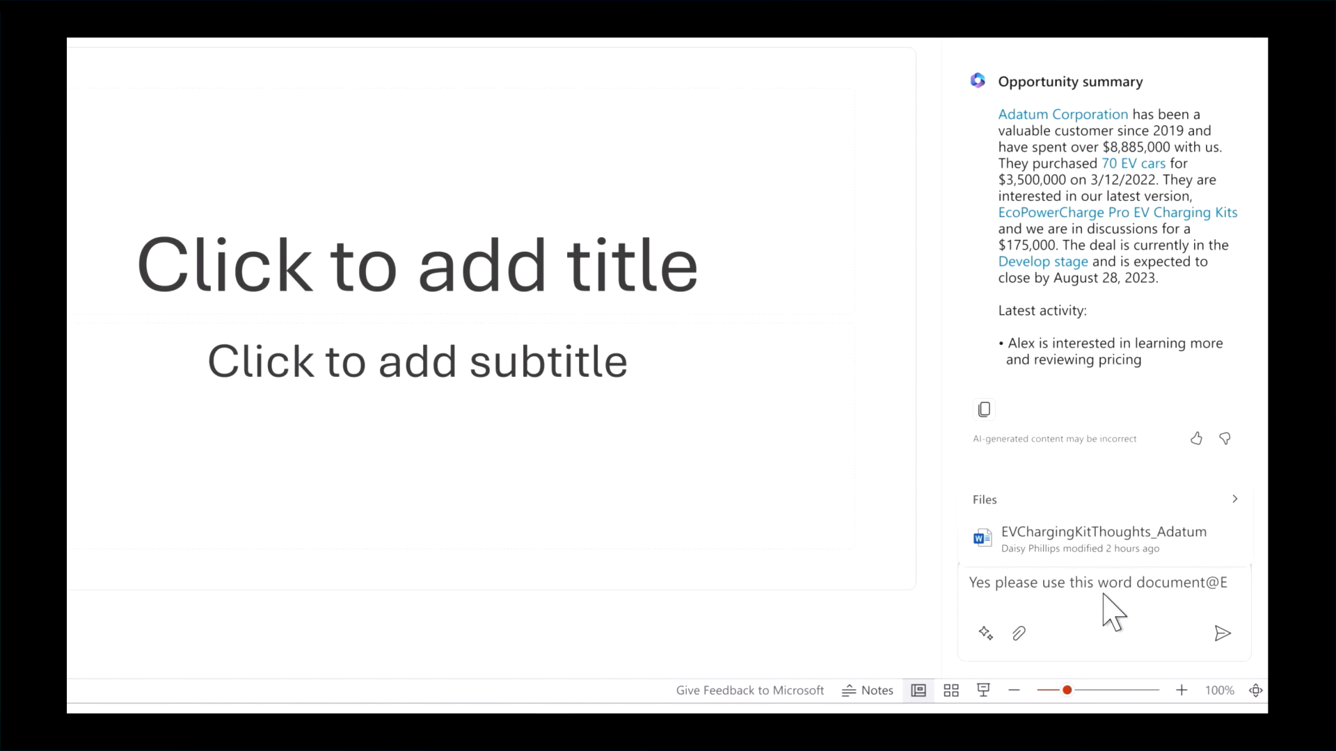 顧客のCRMの情報と、既存のドキュメントに基づいたプレゼンテーションを作成することができます。