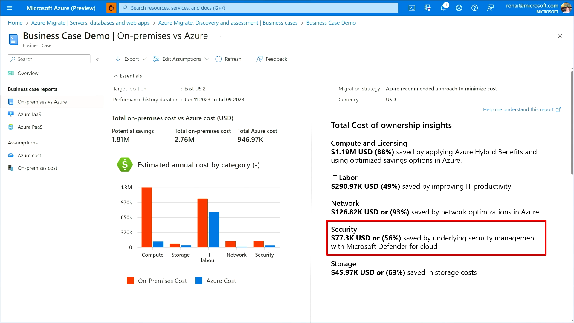 またセキュリティの話も大切です。Azure Migrateで、オンプレミスとAzure のセキュリティ管理コストを比較し、56%節約できることが分かりました。