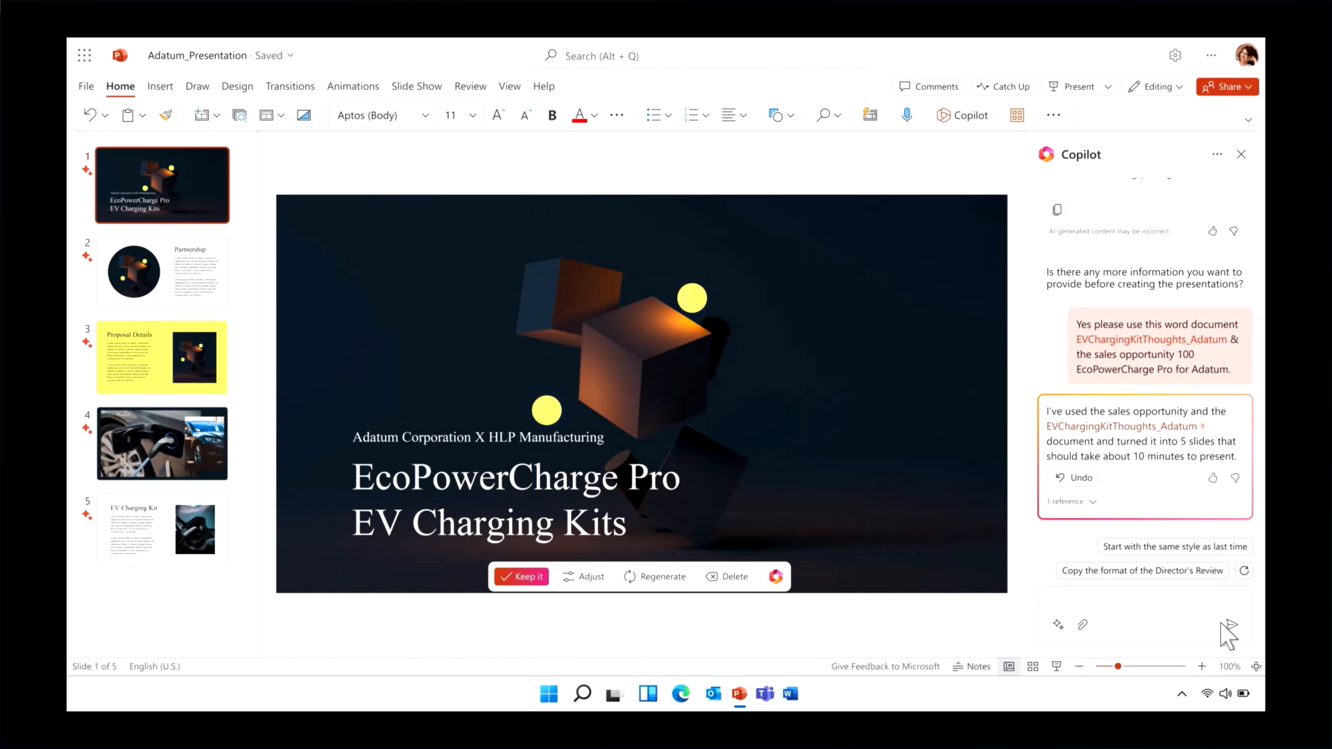 CRMの案件情報と、wordドキュメントの情報をベースとしたプレゼンテーションが作成されました。