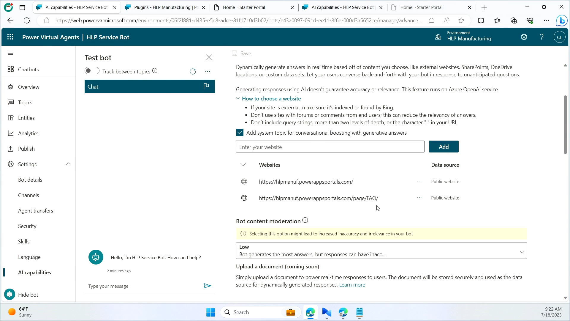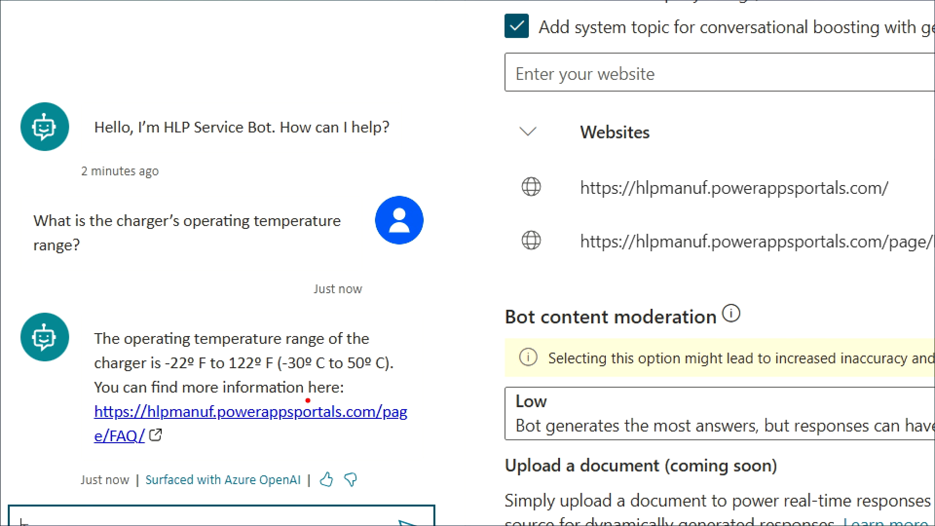 コンテンツをアップロードするだけで、ボットのフローや会話のトピックなどなにも設定していません。