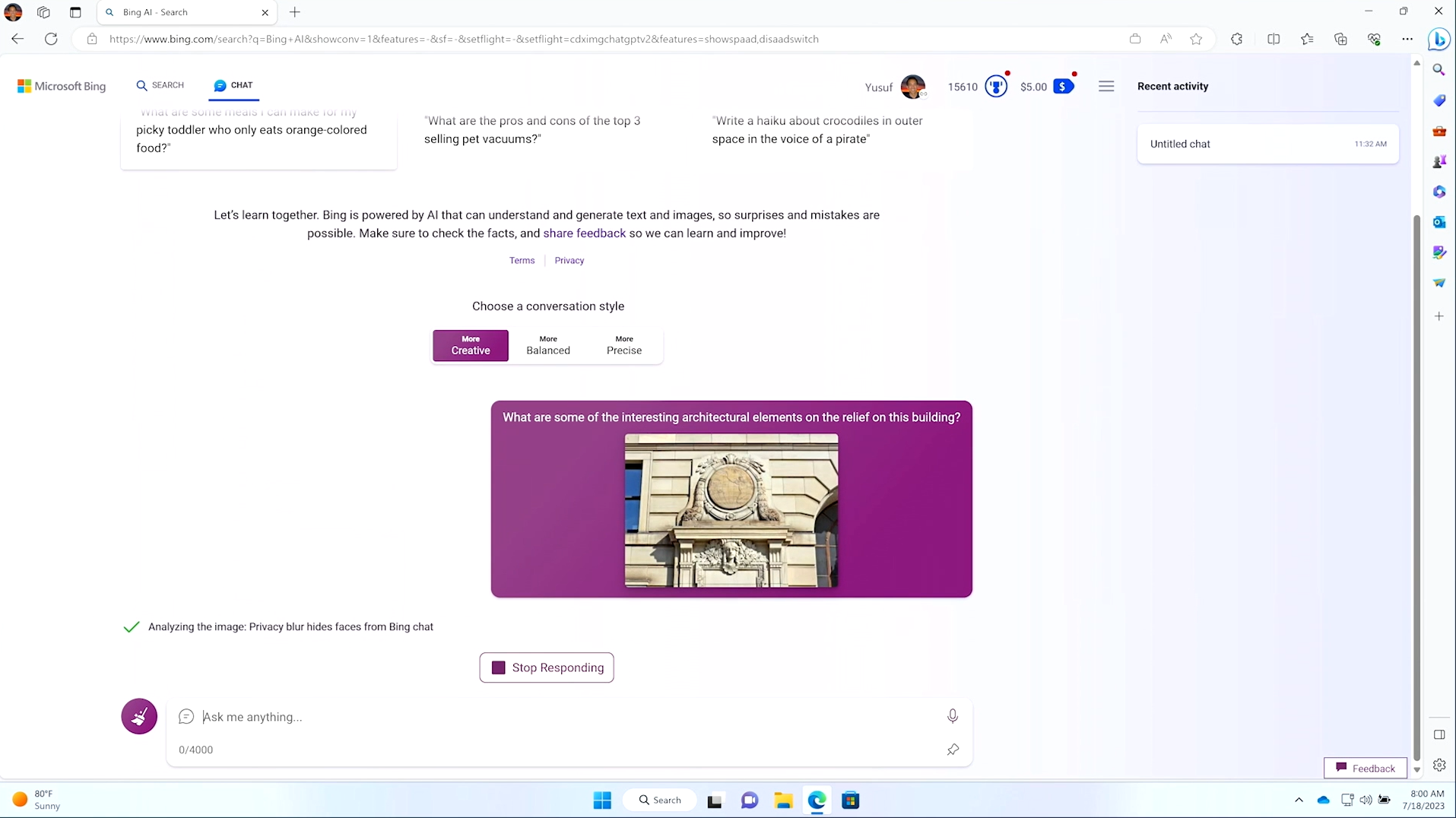Bing Chat Enterprise にイメージをアップロードして、「建物に施されたレリーフの中で、興味深い建築的要素は何ですか?」と質問してみると