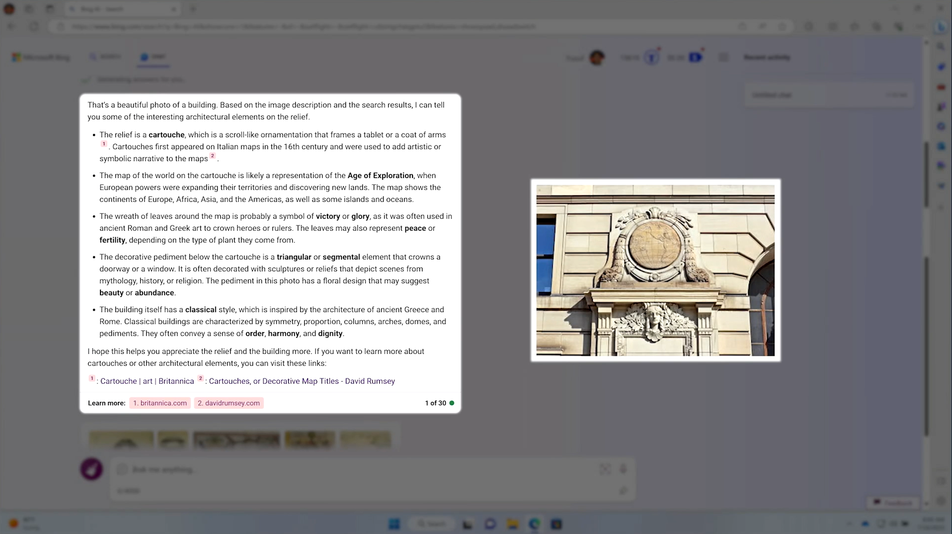 Bing Chat は画像を検出し、これは「カルトゥーシュ」と呼ばれる装飾であり、中央にある世界地図は大航海時代を表していると思われると回答。
