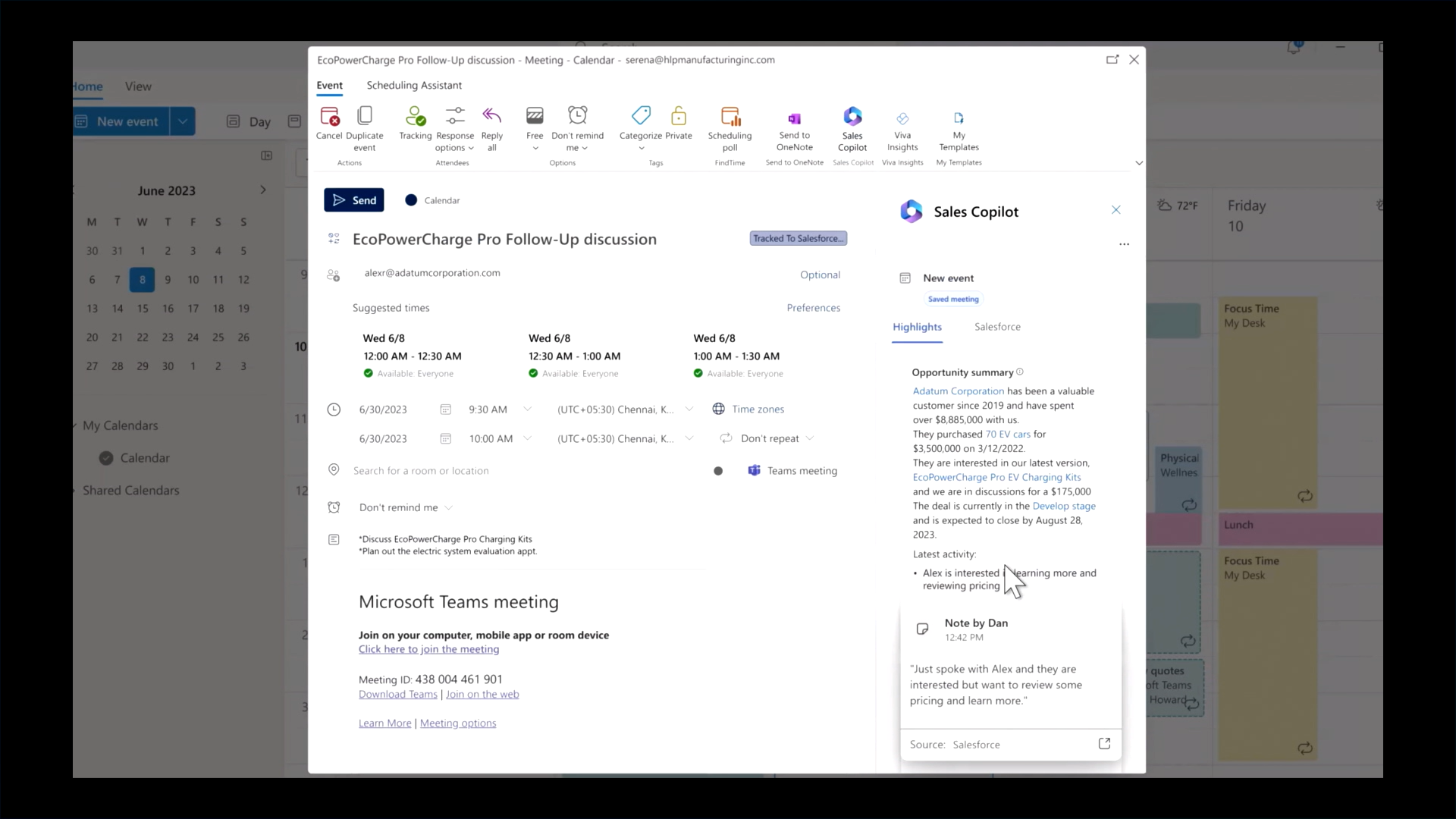 Outlook の予定表をみれば、顧客が何を重要視しているのかといった情報を、過去のメールやCRMツールからAIが抽出して表示してくれます。