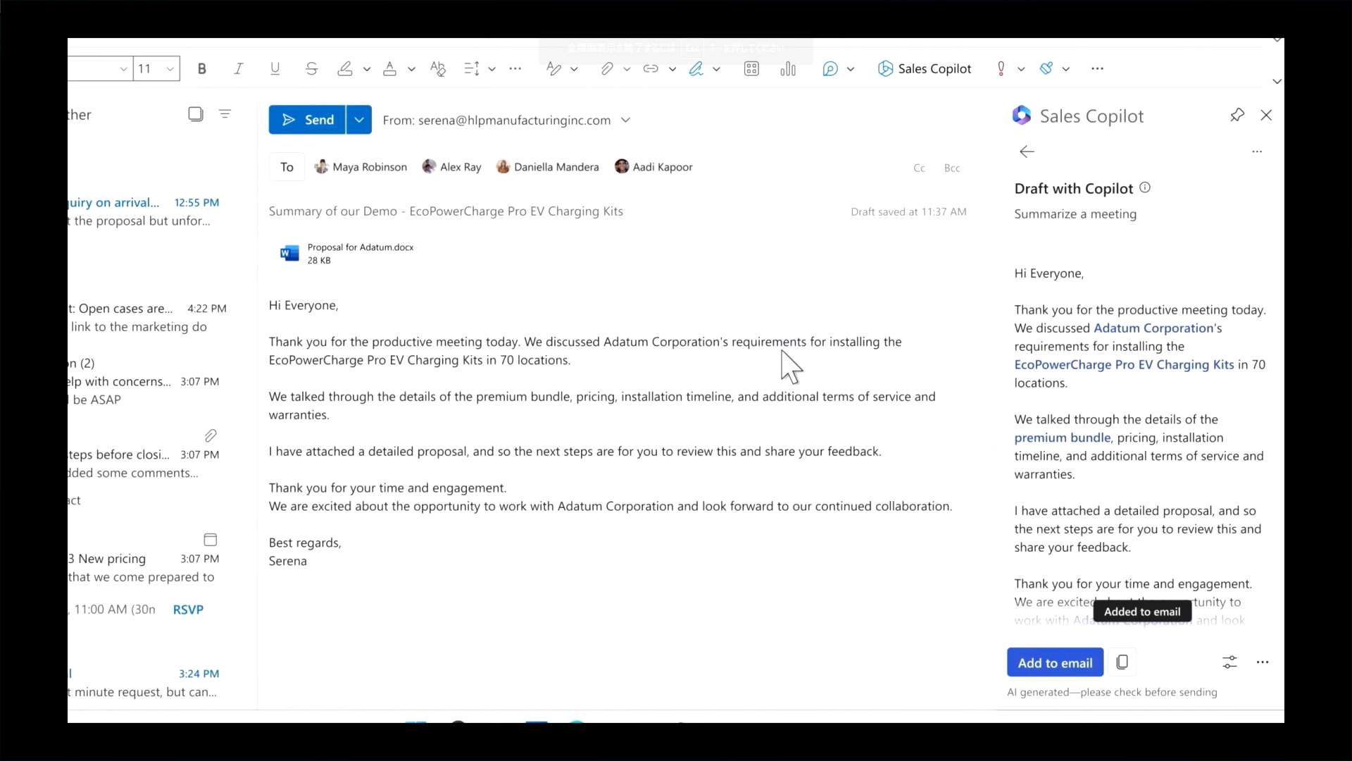 ここに提案書と価格情報も添付して送信すれば、ミーティング後の数秒でメールがお客さんに届きますね。