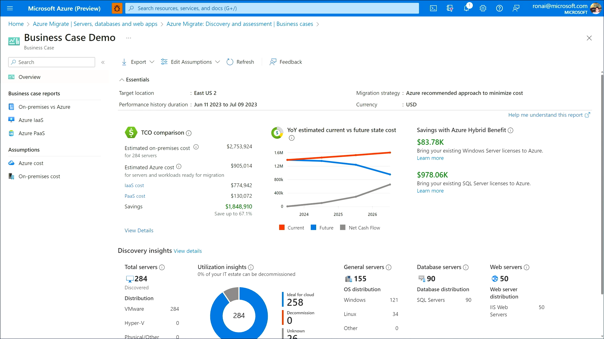 Azure Migrateの画面で、オンプレミスからAzure に移行することで、インフラの維持コストを最大67%削減でき、年間で約200万ドル節約できるといことが分かります。
