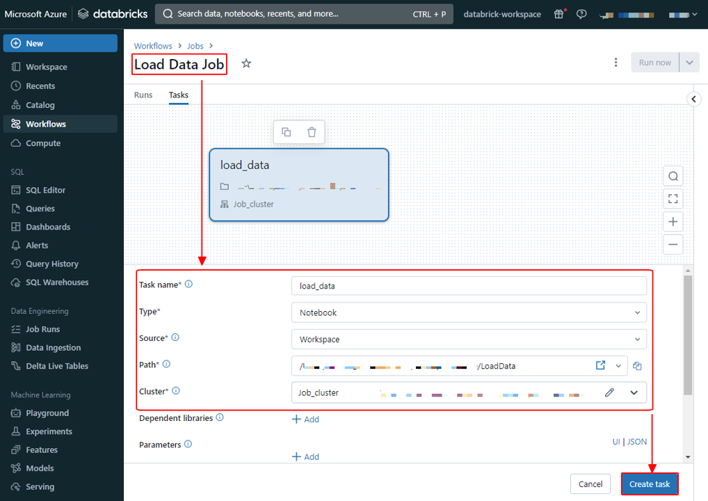 ① ノートブックを実行するジョブを作成するため、Databricks のポータル画面から「Workflows」 → 「Create job」 をクリックします。