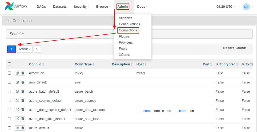 ①  Airflow UI で、メニューから「Admin」 →「Connections」をクリックします。  ボタンをクリックします。