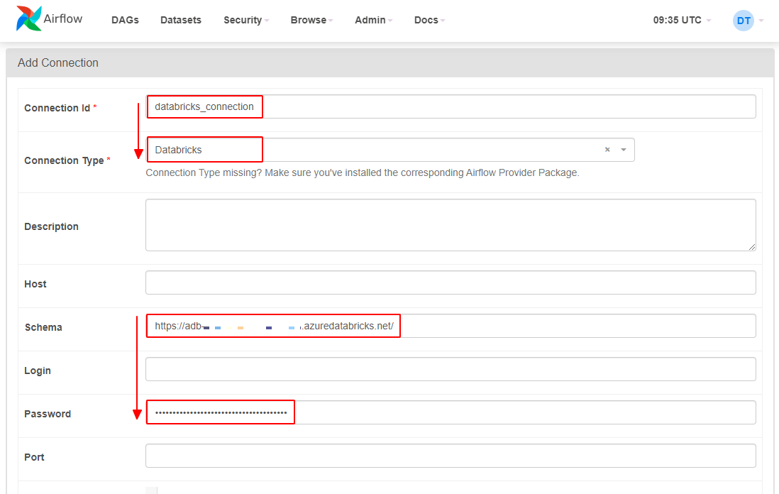 Airflow が Databricks のジョブをトリガーできるように、接続を作成する必要があります。
