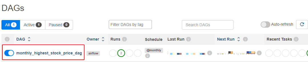 Airflow の「DAGs」ページにて、「monthly_highest_stock_price_dag」という作成した DAG が表示されます。