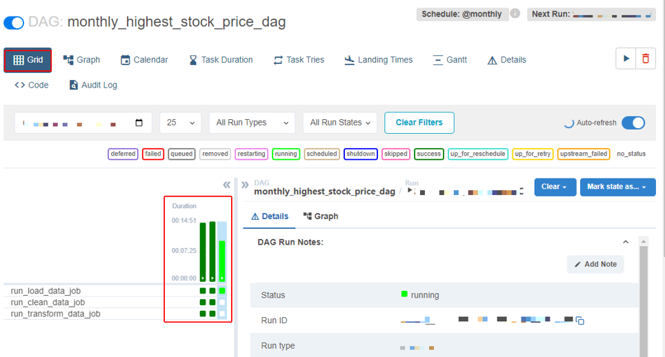 「Grid」タブでは、DAG の実行履歴や状態を表示することができます。