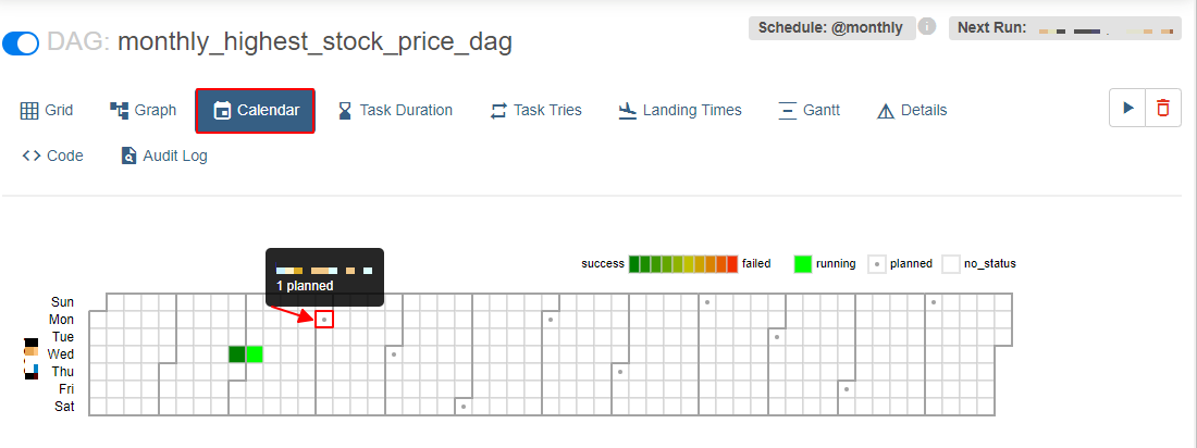 「Calendar」タブでは、DAG のスケジュールされた実行時間が表示されます。
