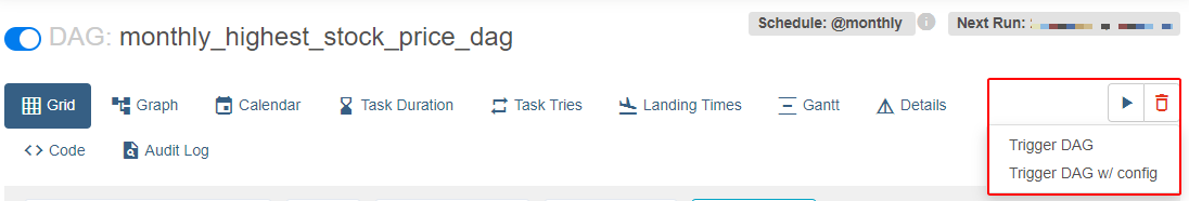 Airflow UI の monthly_highest_stock_price_dag 画面で, 「Trigger DAG」をクリックします。