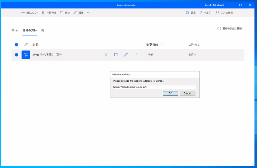 10. 正常にRPAが動作し自動的にURLが開きました。フローの中にURLを埋め込むことで手順9は省き完全に自動化することも可能です。