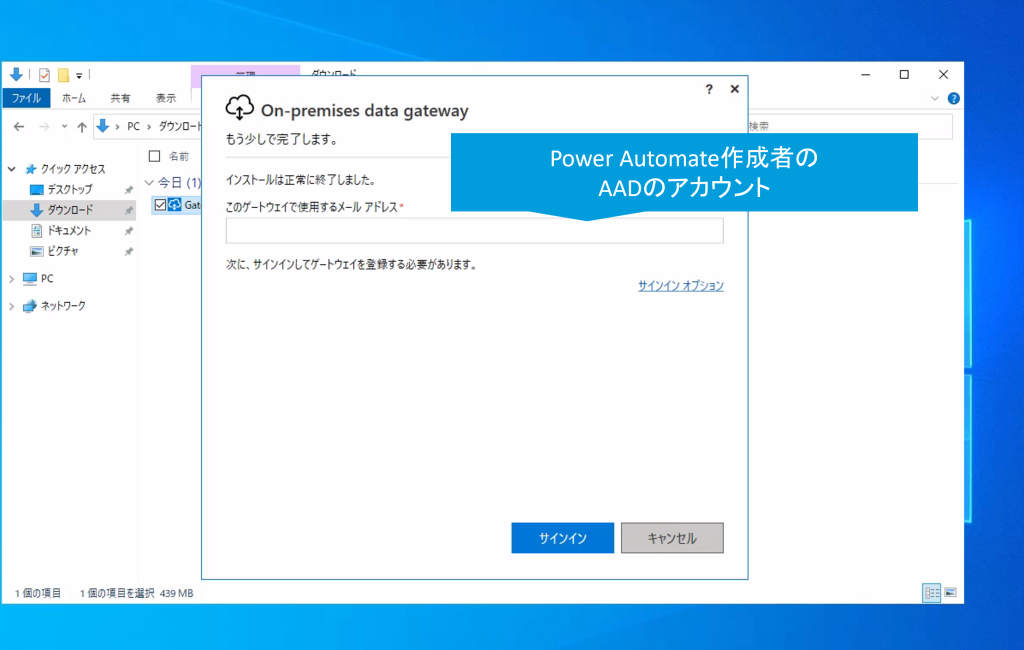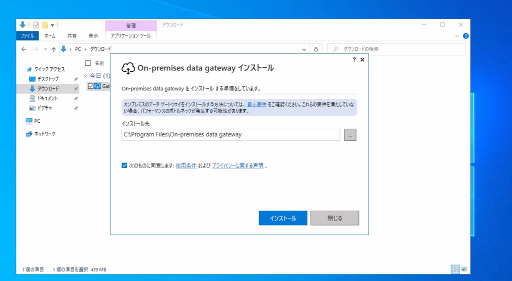 上記URLからオンプレミスゲートウェイをダウンロードし、対象のファイルを操作可能なPCまたはサーバーにインストールします。