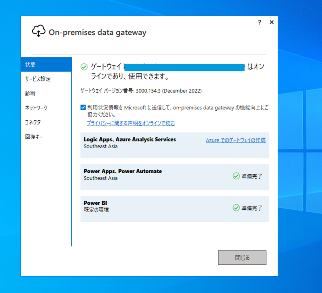 「新しいon-premises data gateway の名前」と回復キーは任意で設定してください。