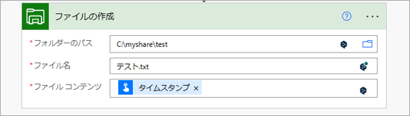 ファイルコンテンツはファイルの中身になります。今回は、Power Automate 実行時のタイムスタンプを入れています。