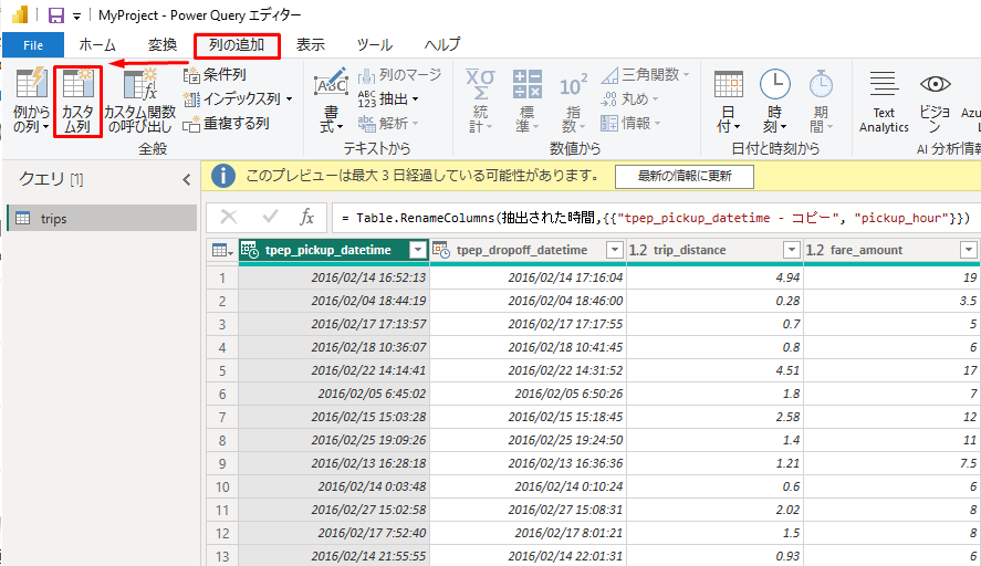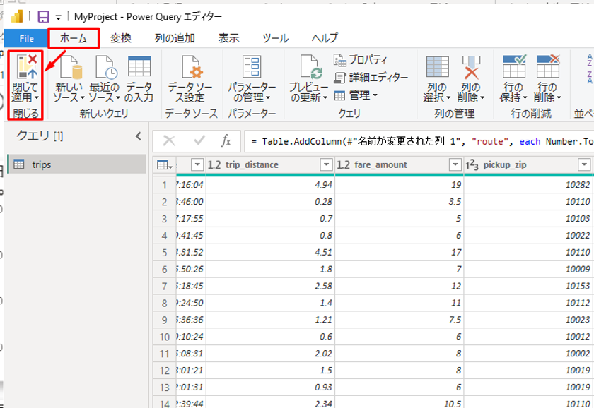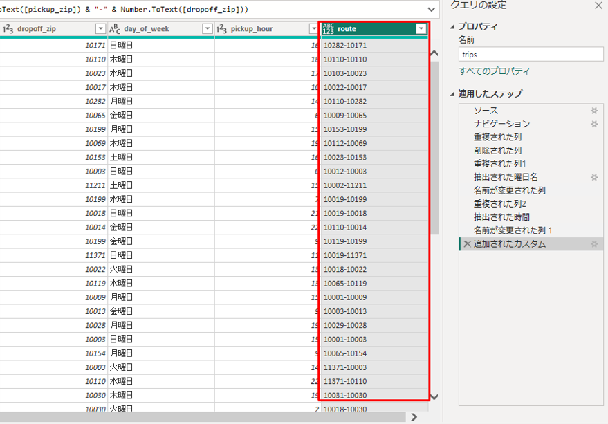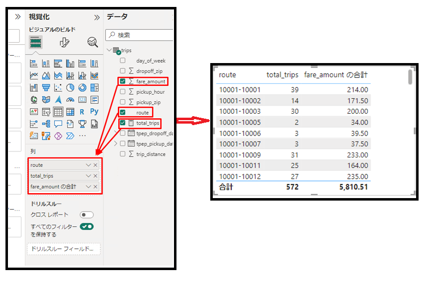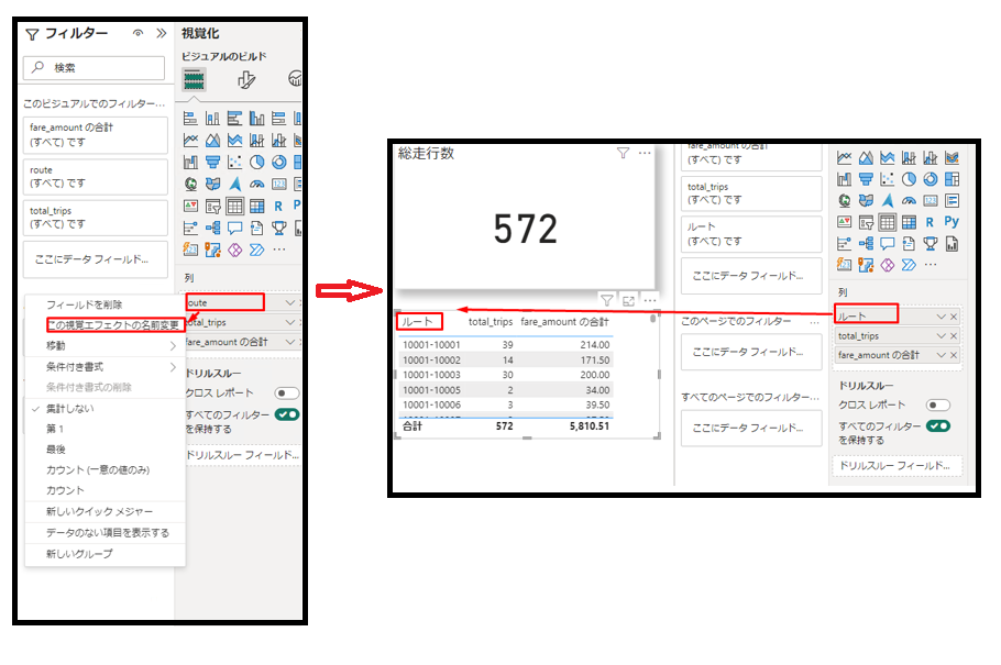 ⑪「total_trip」 を「ルート頻度」に、「fare_amount」を「合計運賃」に名前変更します。