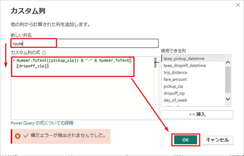 Number.ToText([pickup_zip]) & 「-」 & Number.ToText([dropoff_zip])