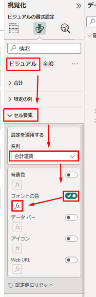 ⑬「ビジュアル」タブで、「セル要素」をクリックします。「系列」項目で「合計運賃」 を選択します。「フォントの色」を有効にして、