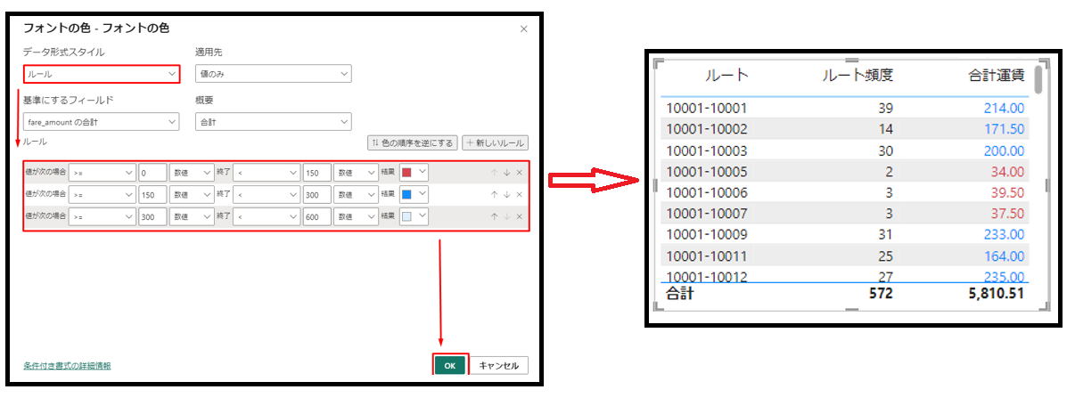 ⑭「データ形式スタイル」項目で「ルール」を選択します。以下の画像のようにルールを入力します。「OK」をクリックします。