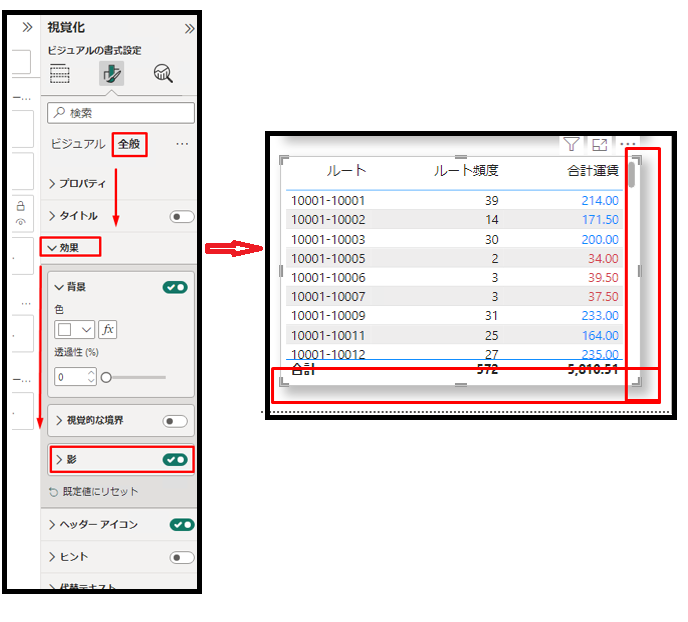 ⑮「全般」タブで「効果」をクリックして、「影」を有効にします。可視化は以下の画像通り表示されます。