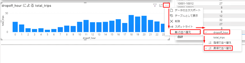アイコンをクリックして「軸の並べ替え」>「dropoff_hour」>「昇順で並べ替え」を選択します。可視化は以下の画像通り表示されます。