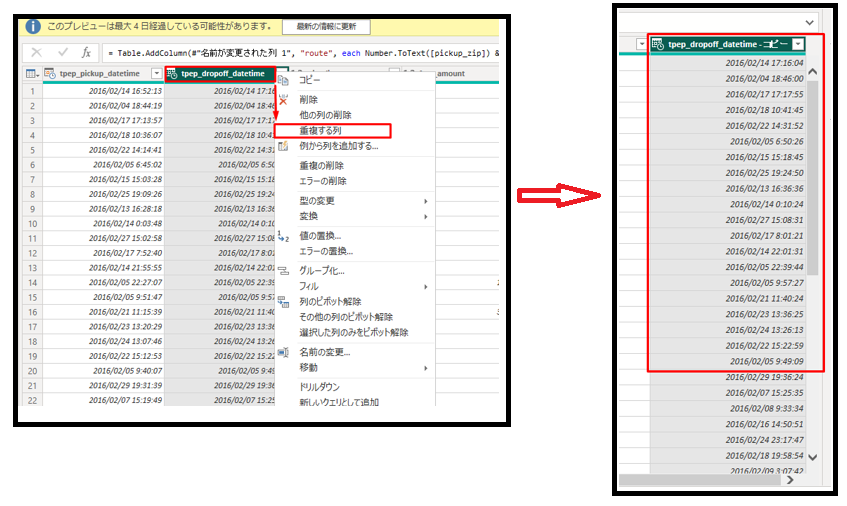 ②「tpep_dropoff_datetime」を右クリックして、「重複する列」をクリックします。テーブルの一番右側に重複する列が作成されます。