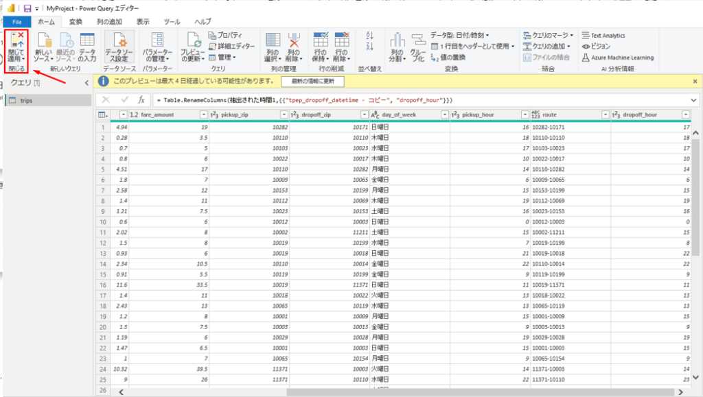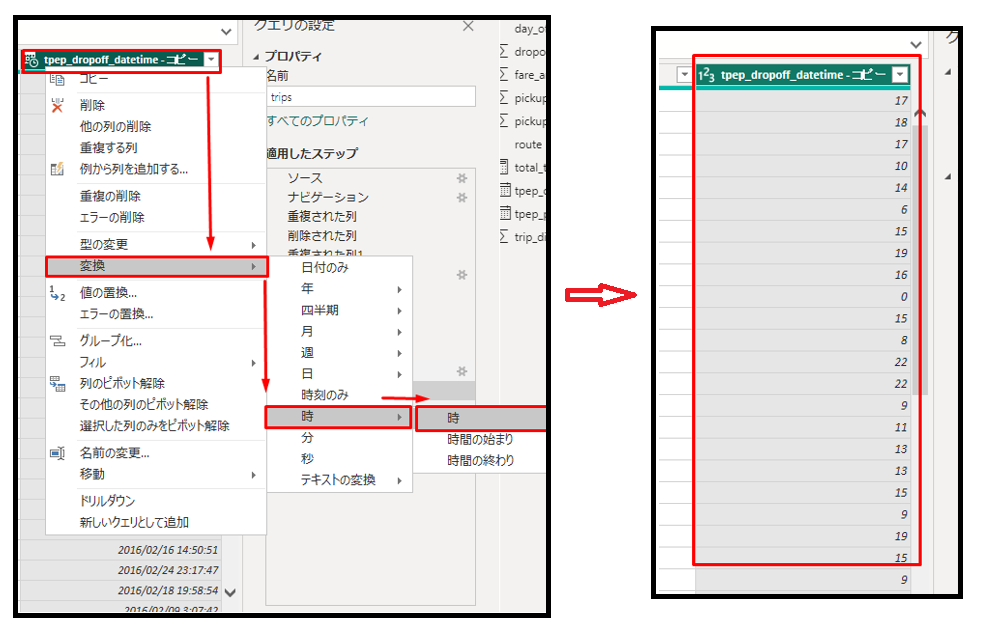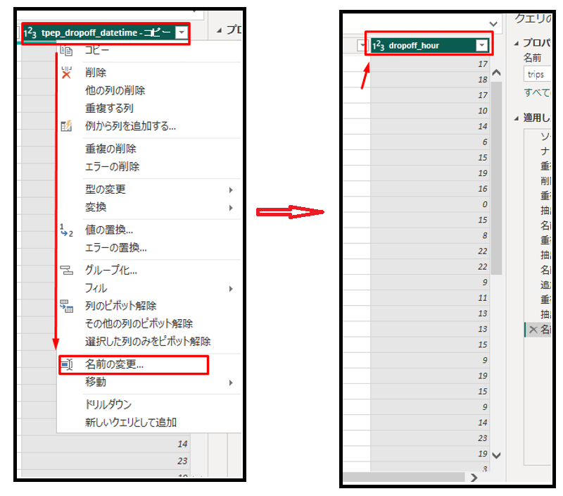④ 作成した列を右クリックして、 「名前の変更」をクリックします。列名を「dropoff_hour」に変更します。