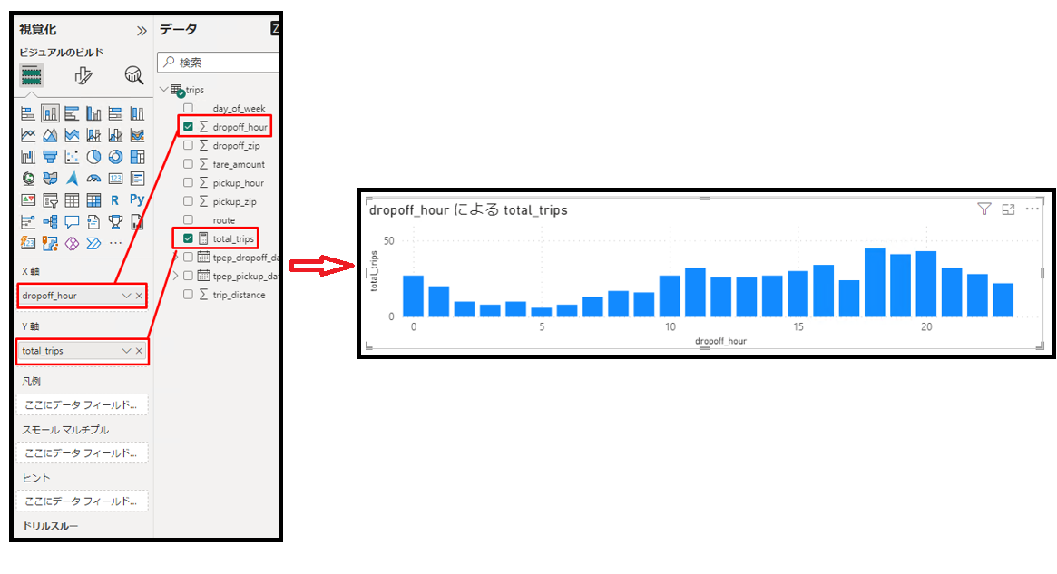⑦「dropoff_hour」を「X 軸」に、「total_trips」を「Y 軸」にドラッグアンドドロップします。可視化は以下の画像通り表示されます。