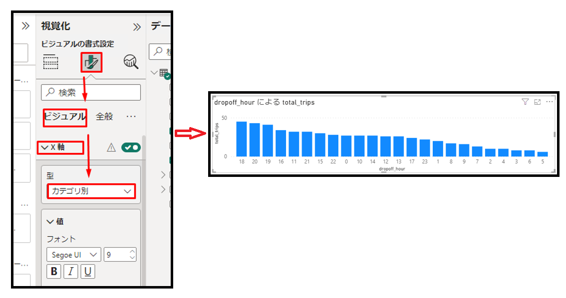 アイコンをクリックして「ビジュアル」タブで「X 軸」をクリックします。「型」項目で「カテゴリ別」を選択します。可視化は以下の画像通り表示されます。