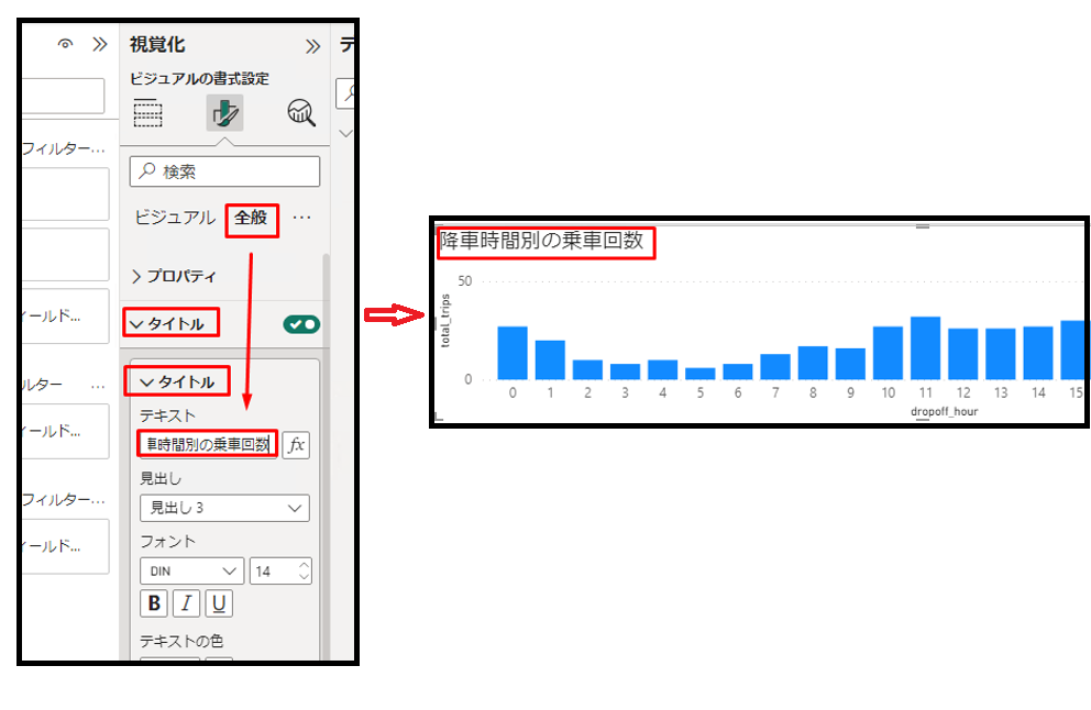 ⑩「全般」タブで「タイトル」を有効にします。 「降車時間別の乗車回数」を入力します。可視化は以下の画像通り表示されます。