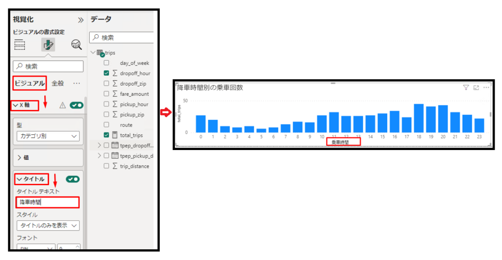 ⑪「ビジュアル」タブで「X 軸」を有効にして、「タイトルテキスト」項目で「降車時間」を入力します。可視化は以下の画像通り表示されます。