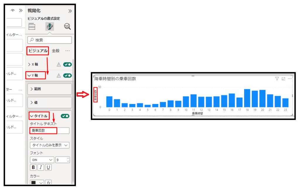 ⑫「ビジュアル」タブで「Y 軸」を有効にして、「タイトルテキスト」項目で「乗車回数」を入力します。可視化は以下の画像通り表示されます。